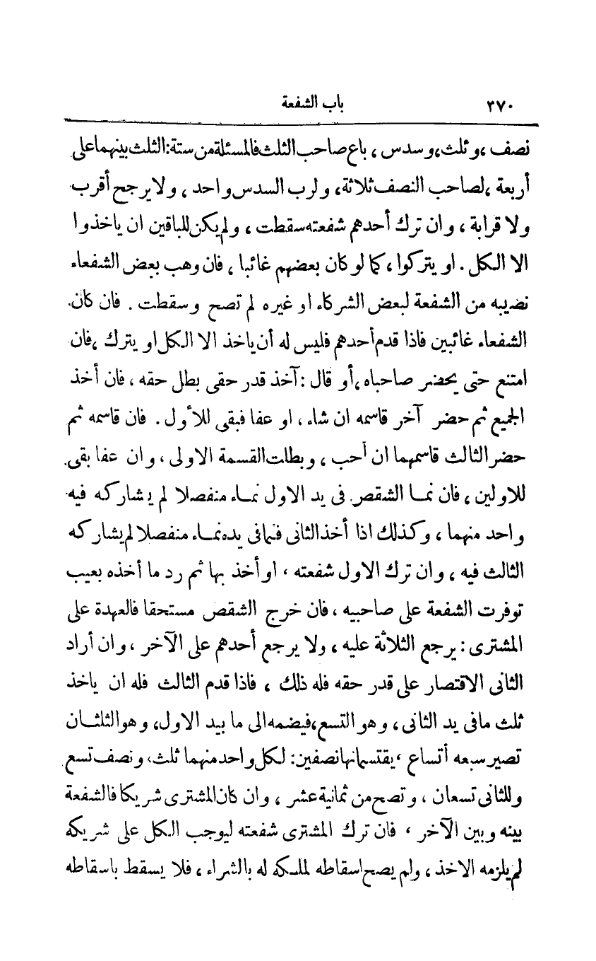 نصف وثلث وسدس باع الثلث فالمسألة من ستة: الثلث بينهما على أربعة لصاحب النصف ثلاثة ولرب السدس واحد ولا يرجح أقرب ولا قرابة وإن ترك أحدهم شفعته سقطت ولم يكن للباقين أن يأخذوا إلا الكل أو يتركوا كما لو كان بعضهم غائبا فإن وهب بعض الشفعاء نصيبه من الشفعة لبعض الشركاء أو غيره لم تصح وسقطت فإن كان الشفعاء غائبين فإذا قدم أحدهم فليس له أن يأخذ إلا الكل أو يترك فإن أمتنع حتى يحضر صاحباه أو قال: آخذ قدر حقي بطل حقه فإن أخذ الجميع ثم حضر آخر قاسمه إن شاء أو عفا فبقي للأول فإن قاسمه ثم حضر الثالث قاسمهما أن أحب وبطلت القسمة الأولى وإن عفا بقي للأولين فإن نما الشقص في يد الأول نماء منفصلا لم يشاركه فيه واحد منهما وكذلك إذا أخذ الثاني فما في يده نماء منفصلا لم يشاركه الثالث فيه وإن ترك الأول شفعته أو أخذ بها ثم رد ما أخذه بعيب توفرت الشفعة على صاحبيه فإن خرج الشقص مستحقا فالعهدة على المشتري: يرجع الثلاثة عليه ولا يرجع أحدهم على الآخر وإن أراد الثاني الاقتصار على قدر حقه فله ذلك فإذا قدم الثالث فله أن يأخذ ثلث ما في يد الثاني وهو التسع فيضعه إلى ما بيد الأول وهو الثلثان تصير سبعه اتساع يقتسمانها نصفين: لكل واحد منهما ثلث ونصف تسع وللثاني تسعان وتصح من ثمانية عشر وإن كان المشتري شريكا فالشفعة بينه وبين الآخر فإن ترك المشتري شفعته ليوجب الكل على شريكه لم يلزمه الأخذ ولم يصح إسقاطه لملكه له بالشراء فلا يسقط بإسقاطه