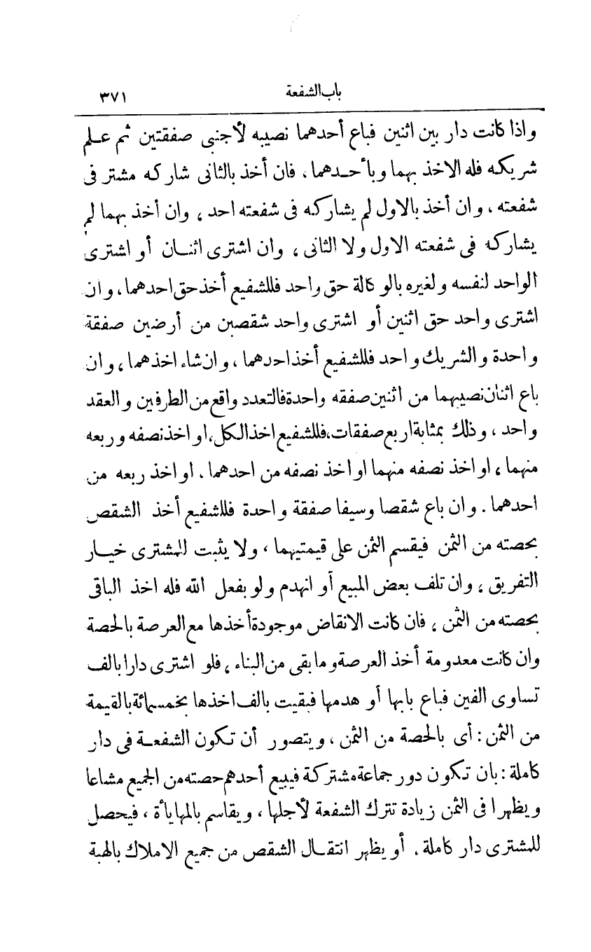 وإذا كانت دار بين أثنين فباع أحدهما نصيبه لأجنبي صفقتين ثم علم شريكه فله الأخذ بهما وبأحدهما فإن أخذ بالثاني شاركه مشتر في شفعته وإن أخذ بالأول لم يشاركه في شفعته أحد وإن أخذ بهما لم يشاركه في شفعته الأول ولا الثاني وإن اشترى اثنان أو اشترى الواحد لنفسه ولغيره بالوكالة حق واحد فللشفيع أخذ حق أحدهما وإن اشترى واحد حق اثنين أو اشترى واحد شقصين من أرضين صفقة واحدة والشريك واحد فللشفيع أخذ أحدهما وإن شاء أخذهما وإن باع اثنان نصيبهما من أثنين صفقة واحدة فالتعدد واقع من الطرفين والعقد واحد وذلك بمثابة أربع صفقات فللشفيع أخذ الكل أو أخذ نصفه وربعه منهما أو أخذ نصفه منهما أو أخذ نصفه من أحدهما أو أخذ ربعه من أحدهما وإن باع شقصا وسيفا صفقة واحدة فللشفيع أخذ الشقص بحصته من الثمن فيقسم الثمن على قيمتيهما ولا يثبت للمشتري خيار التفريق وإن تلف بعض المبيع أو انهدم ولو بفعل الله فله أخذ الباقي بحصته من الثمن فإن كانت الأنقاض موجودة أخذها مع العرصة بالحصة وإن كانت معدومة أخذ العرصة وما بقي من البناء فلو اشترى دارا بألف تساوي ألفين فباع بابها أو هدمها فبقيت بألف أخذ بخمسمائة بالقيمة من الثمن: أي بالحصة من الثمن ويتصور أن تكون الشفعة في دار كاملة: بأن تكون دور جماعة مشتركة فيبيع أحدهم حصته من الجميع مشاعا ويظهرا في الثمن زيادة تترك الشفعة لأجلها ويقاسم بالمهايأة فيحصل للمشتري دار كاملة أو يظهر انتقال الشقص من جميع الأملاك بالهبة