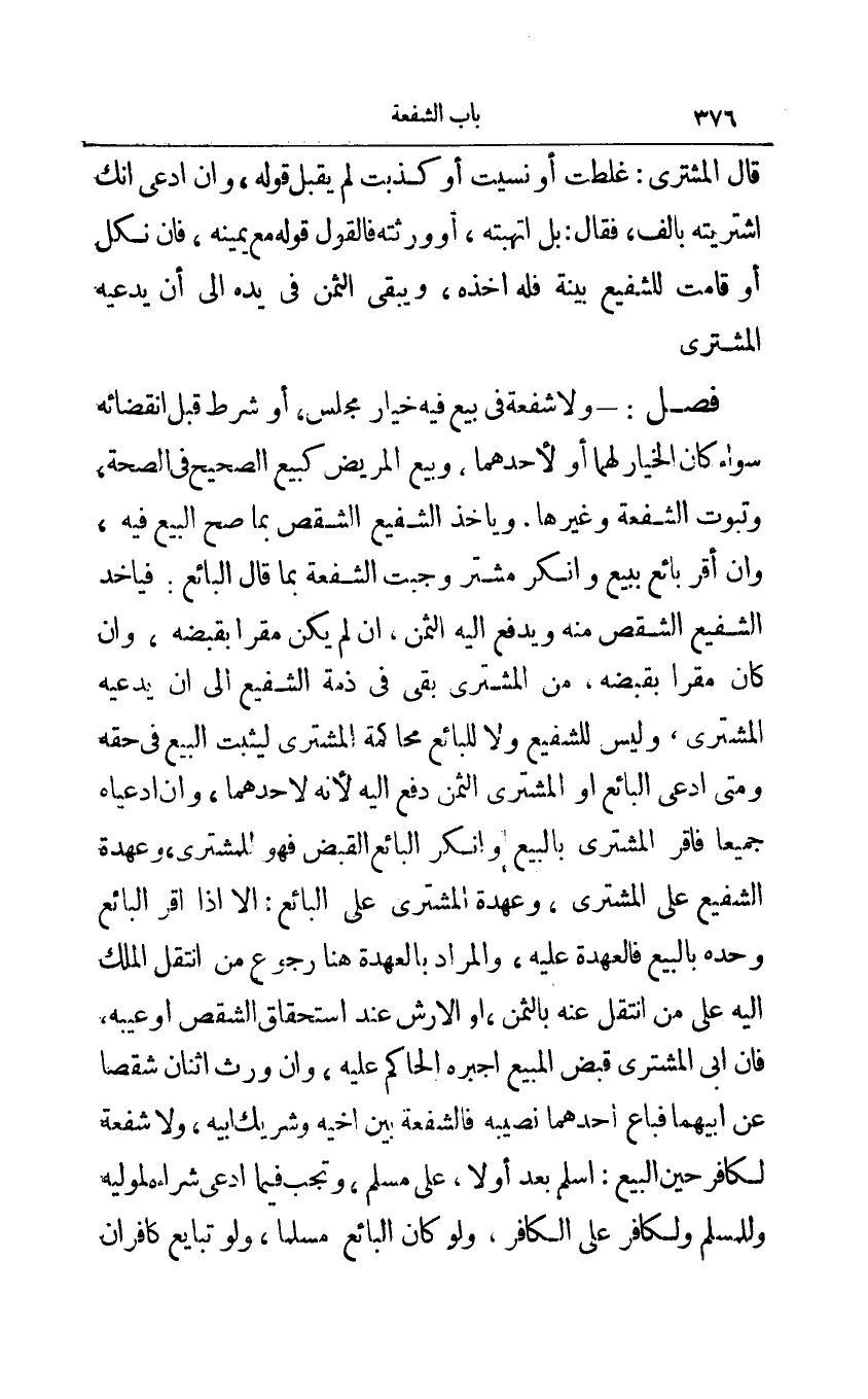 أو شرط قبل انقضائه سواء كان الخيار لهما أو لأحدهما وبيع المريض كبيع الصحيح في الصحة وتبوت الشفعة وغيرها ويأخذ الشفيع الشقص بما صح البيع فيه وإن أقر ببيع وأنكر مشتر وجبت الشفعة بما قال البائع: فيأخذ الشفيع الشقص منه ويدفع إليه الثمن وإن لم يكن مقرا بقبضه وإن كان مقرا بقبضه من المشتري بقي في ذمة الشفيع إلى أن يدعيه المشتري وليس للشفيع ولا للبائع محاكمة المشتري ليثبت البيع في حقه ومتى ادعى البائع أو المشتري الثمن دفع إليه لأنه لأحدهما وإن ادعياه جميعا فأقر المشتري بالبيع وأنكر البائع القبض فهو للمشتري وعهدة الشفيع على المشتري وعهدة المشتري على البائع: إلا إذا أقر البائع وحده بالبيع فالعهدة عليه والمراد بالعهدة هنا رجوع من انتقل الملك إليه على من انتقل عنه بالثمن أو الأرش عند استحقاق الشقص أو عيبه فإن أبى المشتري قبض المبيع أجبره عليه وإن ورث اثنان شقصا عن أبيهما فباع أحدهما نصيبه فالشفعة بين أخيه وشريك أبيه ولا شفعة لكافر حين البيع: أسلم بعد أو لا على مسلم وتجب فيما أدعى شراء لموليه وللمسلم ولكافر على الكافر ولو كان البائع مسلما ولو تبايع كافران