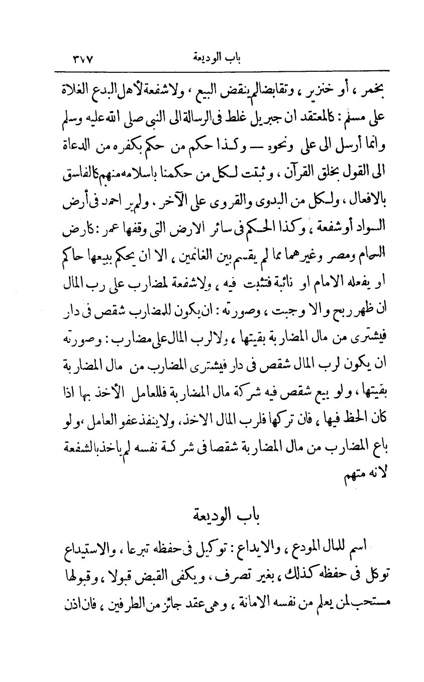 بخمر أو خنزير وتقابضا لم ينقض البيع ولا شفعة لأهل البدع الغلاة على مسلم: كالمعتقد أن جبريل غلط في الرسالة إلى النبي صلى الله عليه وسلم وإنما أرسل إلى علي ونحوه - وكذا حكم من حكم بكفره من الدعاة إلى القول بخلق القرآن وثبتت لكل من حكمنا بإسلامه منهم كالفاسق بالأفعال ولكل من البدوي والقروي على الآخر ولم ير أحمد في أرض السواد أو شفعة وكذا الحكم في سائر الأرض التي وقفها عمر: كأرض الشام ومصر وغيرهما مما لم يقسم بين الغانمين إلا أن يحكم ببيعها حاكم أو يفعله الإمام أو نائبه فتثبت فيه ولا شفعة لمضارب على رب المال إن ظهر ربح وإلا وجبت وصورته: أن يكون للمضارب شقص في دار فيشتري من مال المضاربة بقيتها ولا لرب المال على مضارب: وصورته أن يكون لرب المال شقص في دار فيشتري المضارب فللعامل الأخذ بها إذا كان الحظ فيها فإن تركها فلرب المال الأخذ ولا ينفذ عفو العامل ولو باع المضارب من مال المضاربة شقصا في شركة نفسه لم يأخذ بالشفعة لأنه متهم.