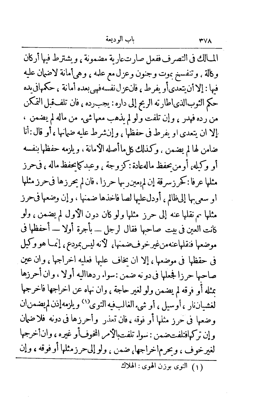 المالك في التصرف فعل صارت عارية مضمونة ويشترط فيها أركان وكالة وتنفسخ بموت وجنون وعزل مع علمه وهي أمانة لا ضمان عليه فيها: إلا أن يتعدى أو يفرط فإن عزل نفسه فهي بعده أمانة حكمها في يده حكم الثوب الذي أطارته الريح إلى داره: يجب رده فإن تلف قبل التمكن من رده فهدر وإن تلفت ولو لم يذهب معها شيء من ماله لم يضمن إلا أن يتعدى أو يفرط في حفظها وإن اشترط عليه ضمانها أو قال: أنا ضامن لها لم يضمن وكذلك ما أصله الأمانة ويلزمه حفظها بنفسه أو وكيله أو من يحفظ ما له عادة: كزوجة وعبد كما يحفظ ماله في حرز مثلها عرفا: كحرز سرقة إن لم يعين بها حرزا فإن لم يحرزها في حرز مثلها أو سعى بها إلى ظالم أو دل عليها لصا فأخذها ضمنها وإن وضعها في حرز مثلها ثم نقلها عنه إلى حرز مثلها ولو كان دون الأول لم يضمن ولو كانت العين في بيت صاحبها فقال لرجل - بأجرة أو لا - أحفظها في موضعها فنقلها عنه من غير خوف ضمنها لأنه ليس بمودع إنما هو وكيل في حفظها في موضعها إلا أن يخاف عليها فعليه إخراجها وإن عين صاحبها حرزا فجعلها في دونه ضمن: سواء ردها إليه أو لا وإن أحرزها بمثله أو فوقه لم يضمن ولو لغير حاجة وإن نهاه عن إخراجها فأخرجها لغشيان نار أو شيل أو شيء الغالب فيه التوى1 ويلزمه إذن لم يضمن إن وضعها في حرز مثلها أو فوقه فإن تعذر وأحرزها في دونه فلا ضمان وإن تركها فتلفت ضمن: سواء تلفت بالأمر المخوف أو غيره وإن أخرجها لغير خوف ويحرم إخراجها ضمن ولو إلى حرز مثلها أو فوقه وإن