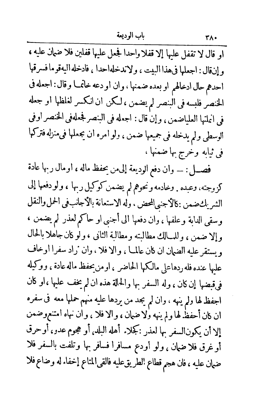 أو مال ربها عادة كزوجته وعبده وخادمه ونحوهم لم يضمن كوكيل ربها ولو دفعها إلى الشريك ضمن: كالأجنبي المحض وله الاستعانة بالأجانب في الحمل والنقل وسقي الدابة وعلفها وإن دفعها إلى أجنبي أو حاكم لعذر لم يضمن وإلا ضمن وللمالك مطالبته ومطالبة الثاني ولو كان جاهلا بالحال ويستقر عليه الضمان إن كان عالما وإلا فلا وإن أراد سفرا أو خاف عليها عنده فله ردها على مالكها الحاضر أو من يحفظ ماله عادة ووكيله في قبضها إن كان وله السفر بها والحالة هذه إن لم يخف عليها أو كان أحفظ لها ولم ينهه وإن لم يجد من يردها عليه منهم حملها معه في سفره إن كان أحفظ لها ولم ينهه ولا ضمان وإلا فلا وإن نهاه امتنع وضمن إلا أن يكون السفر به لعذر: كجلاء أهله البلد أو هجوم عدو أو حرق أو غرق فلا ضمان ولو أودع مسافرا فسافر بها وتلفت بالسفر فلا ضمان عليه فإن هجم قطاع الطريق عليه فألقى المتاع إخفاء له وضاع فلا