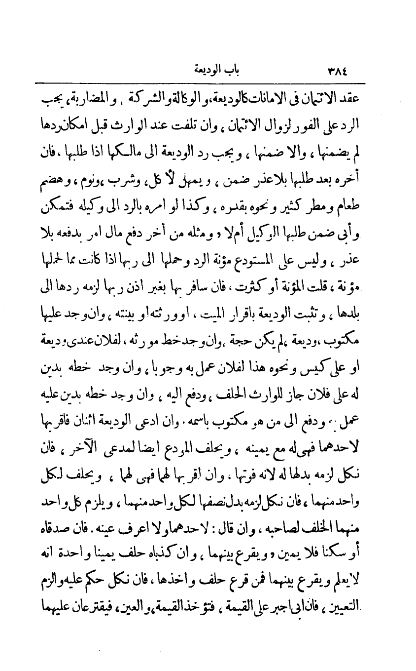 عقد الائتمان في الأمانات كالوديعة والوكالة والشركة والمضاربة يجب الرد على الفور لزوال الائتمان وإن تلفت عند الوارث قبل إمكان ردها لم يضمنها وإلا ضمنها ويجب رد الوديعة إلى مالكها إذا طلبها فإن أخره بعد طلبها بلا عذر ضمن ويمهل لأكل وشرب ونوم وهضم طعام ومطر كثير ونحوه بقدره وكذا لو أمره بالرد إلى وكيله فتمكن وأبى ضمن طلبها الوكيل أم لا ومثله من أخر دفع مال أمر بدفعه بال عذر وليس على المستودع مؤنة الرد وحملها إلى ربها إذا كانت مما لحملها مؤنة قلت المؤنة أو كثرت فإن سافر بها بغير أذن ربها لزمه ردها إلى بلدها وتثبت الوديعة بإقرار الميت أو ورثته أو بينته وإن وجد عليها مكتوب وديعة لم يكن حجة وإن وجد خط مورثه لفلان عندي وديعة أو على كيس ونحوه هذا لفلان عمل به وجوبا وإن وجد خطه بدين له على فلان جاز للوارث الحلف ودفع إليه وإن وجد خطه بدين عليه عمل ودفع إلى من هو مكتوب باسمه وإن ادعى الوديعة اثنان فأقر بها لأحدهما فهي له مع يمينه ويحلف المودع أيضا لمدعي الآخر فإن نكل لزمه بدلها لأنه فوتها وإن أقر بها لهما فهي لهما ويحلف لكل واحد منهما فإن نكل لزمه بدل نصفها لكل واحد منهما ويلزم كل واحد منهما الخلف لصاحبه وإن قال: لأحدهما ولا أعرف عينه فإن صدقاه أو سكنا فلا يمين ويقرع بينهما وإن كذباه حلف يمينا واحدة أنه لا يعلم ويقرع بينهما فمن قرع حلف وأخذها فإن نكل حكم عليه وألزم التعيين فإن أبى أجبر على القيمة فتؤخذ القيمة والعين فيقترعان عليهما