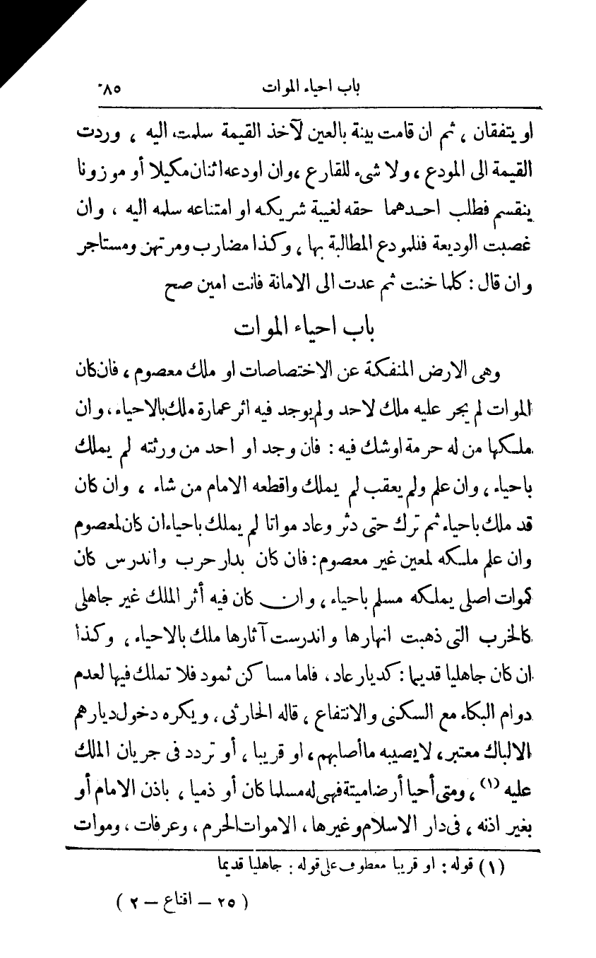 وهي الأرض المنفكة عن الاختصاصات أو ملك معصوم فإن كان الموات لم يجز عليه ملك لأحد ولم يوجد فيه أثر عمارة ملك بالأحياء وإن ملكها من له حرمة أو شك فيه: فإن وجد أو أحد من وثته لم يملك بإحياء وإن علم ولم يعقب لم يملك وأقطعه الإمام من شاء وإن كان قد ملك بإحياء ثم ترك حتى دثر وعاد مواتا لم يملك بإحياء إن كان لمعصوم وإن علم ملكه لمعين غير معصوم: فإن كان بدار حرب وأندرس كان كموات أصلى يملكه مسلم بإحياء وإن كان فيه أثر الملك غير جاهلي كالخرب التي ذهبت أنهارها واندرست آثارها ملك بالأحياء وكذا إن كان جاهليا قديما: كديار عاد فأما مساكن ثمود فلا تملك فيها لعدم دوام البكاء مع السكنى والانتفاع قاله الحارثي ويكره تملك دخول ديارهم إلا لباك معتبر لا يصيبه ما أصابهم أو قريبا أو تردد في جريان الملك عليه1 ومتى أحيا أرضا ميتة فهي له مسلما كان أو ذميا بأذن الإمام أو بغير أذنه في دار الإسلام وغيرها إلا موات الحرم وعرفات وموات