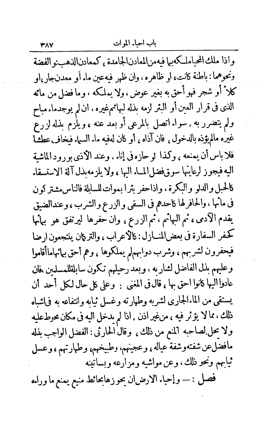 وإذا ملك المحيا ملكه بما فيه من المعادن الجامدة كمعادن الذهب والفضة ونحوهما: باطنة كانت أو ظاهرة وإن ظهر فيه عين ماء أو معدن جار أو كلأ أو شجرة فهو أحق به بغير عوض ولا يملكه وما فضل من مائه الذي في قرار العين أو البئر لزمه بذله لبهائم غيره إن لم يوجد ماء مباح ولم يتضرر به سواء اتصل بالمرعى أو بعد عنه ويلزم بذله لزرع غيره ما لم يؤذه بالدخول فإن آذاه أو كان له فيه ماء السماء فيخاف عطشا فلا بأس أن يمنعه وكذا لو حازه في إناء وعند الأذى بورود الماشية إليه فيجوز لرعايتها سوق فضل الماء إليها ولا يلزمه بذل آلة الاستسقاء كالحبل والدلو والبكرة وإذا حفر بئرا بموات للسابلة فالناس مشتركون في مائها والحافر لها كأحدهم في السقي والزرع والشرب وعند الضيق يقدم الآدمي ثم البهائم ثم الزرع وإن حفرها ليرتفق هو بمائها كحفر السفارة في بعض المنازل: كالأعراب والتركمان ينتجعون أرضا فيحفرون لشربهم وشرب دوابهم لم يملكوها وهو أحق بمائها ما أقاموا وعليهم بذلك الفاضل لشاربه وبعد رحيلهم تكون سابلة للمسلمين فإن عادوا إليها كانوا أحق بها قال في المغني: وعلى كل حال لكل أحد أن يستقي من الماء الجاري لشربه وطهارته وغسل ثيابه وانتفاعه به في أشباه ذلك مما لا يؤثر فيه من غير إذن إذا لم يدخل إليه في مكان محوط عليه ولا يحل لصاحبه المنع من ذلك وقال الحارثي: الفضل الواجب بذله ما فضل عن شفته وشفة عياله وعجينهم وطبيخهم وطهارتهم وغسل ثيابهم ونحو ذلك وعن مواشيه ومزارعه وبساتينه.