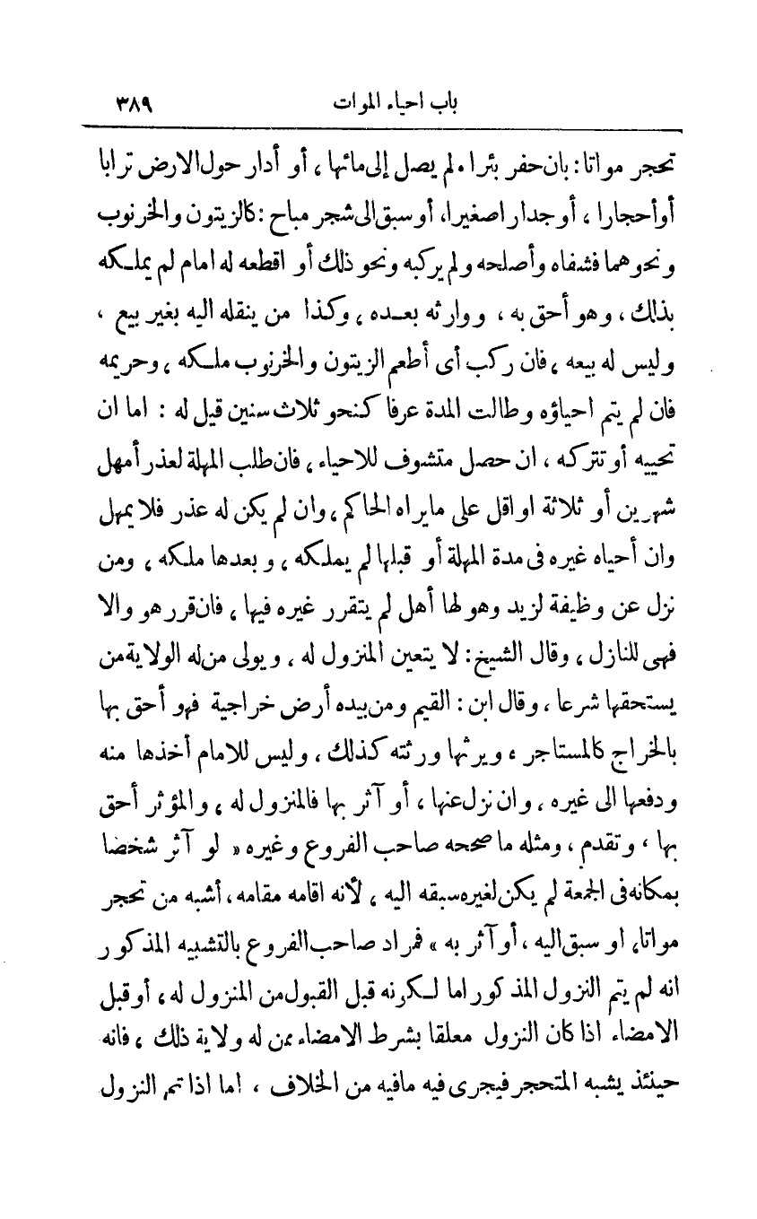 تحجر مواتا: بأن حفر بئرا لم يصل إلى مائها أو أدار حول الأرض ترابا أو أحجارا أو جدارا صغيرا أو سبق إلى شجر مباح: كالزيتون والخرنوب ونحوهما فشفاه وأصلحه ولم يركبه ونحو ذلك أو اقطعه له إمام لم يملكه بذلك وهو أحق به ووارثه بعده وكذا من ينقله إليه بغير بيع وليس له بيعه فإن ركب أي أطعم الزيتون والخرنوب ملكه وحريمه فإن لم يتم أحياؤه وطالت المدة عرفا كنحو ثلاث سنين قيل له: إما أن تحييه أو تتركه إن حصل متشوف للأحياء فإن طلب المهلة لعذر أمهل شهرين أو ثلاثة أو أقل على ما يراه الحاكم وإن لم يكن له عذر فلا يمهل وإن أحياه غيره في مدة المهلة أو قبلها لم يملكه وبعدها ملكه ومن نزل وظيفة لزيد وهو لها أهل لم يتقرر غيره فيها فإن قرر هو وإلا فهي للنازل وقال الشيخ: لا يتعين المنزول له ويولى من له الولاية من يستحقها شرعا وقال ابن القيم: ومن بيده أرض خراجيه فهو أحق بها بالخراج كالمستأجر ويرثها ورثته كذلك وليس للإمام أخذها منه ودفعها إلى غيره وإن نزل عنها أو آثر بها فالمنزول له والمؤثر أحق بها وتقدم ومثله ما صححه صاحب الفروع وغيره لو آثر شخصا بمكانه في الجمعة لم يكن لغيره سبقه إليه لأنه أقامه مقامه أشبه من تحجر مواتا أو سبق إليه أو آثر به فمراد صاحب الفروع بالتشبيه المذكور أنه لم يتم النزول المذكور إما لكونه قبل القبول من المنزول له أو قبل الإمضاء إذا كان النزول معلقا بشرط الإمضاء ممن له ولاية ذلك فإنه حينئذ يشبه المتحجر فيجري فيه ما فيه من الخلاف أما إذا تم النزول