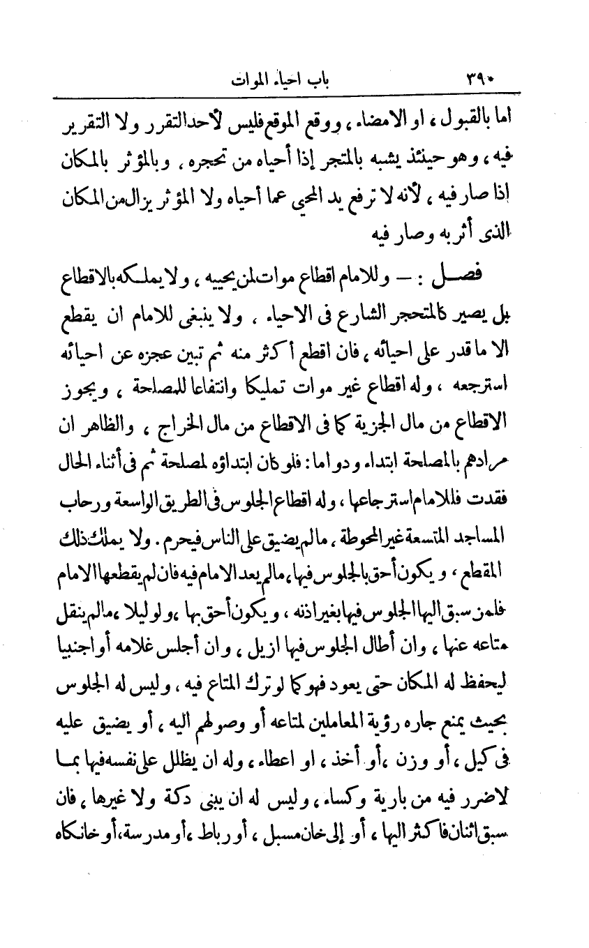 ولا يملكه بالإقطاع بل يصير كالمتحجر الشارع في الأحياء ولا ينبغي للإمام أن يقطع إلا ما قدر على إحيائه فإن اقطع أكثر منه ثم تبين عجزه عن إحيائه استرجعه وله إقطاع غير موات تمليكا وانتفاعا للمصلحة ويجوز الإقطاع من مال الجزية كما في الإقطاع من مال الخراج والظاهر أن مرادهم بالمصلحة ابتداء ودواما فلو كان ابتداؤه لمصلحة ثم في أثناء الحال فقدت فللإمام استرجاعها وله إقطاع الجلوس في الطريق الواسعة ورحاب المساجد المتسعة غير المحوطة مالم يضيق على الناس فيحرم ولا يملك ذلك المقطع ويكون أحق بالجلوس فيها ما لم يعد الإمام فيه فإن لم يقطعها الإمام فلمن سبق إليها الجلوس فيها بغير أذنه ويكون أحق بها ولو ليلا ما لم ينقل متاعه عنها وإن أطال الجلوس فيها أزيل وإن أجلس غلامه أو أجنبيا ليحفظ له المكان حتى يعود فهو كما لوترك المتاع فيه وليس له الجلوس بحيث يمنع جاره رؤية المعاملين لمتاعه أو وصولهم إليه أو يضيق عليه في كيل أو وزن أو أخذ أو إعطاء وله أن يظلل على نفسه فيها بما لا ضرر فيه من بارية وكساء وليس له أن يبني دكة ولا غيرها فإن سبق اثنان فأكثر إليها أو إلى خان مسبل أو رباط أو مدرسة أو خانكاه