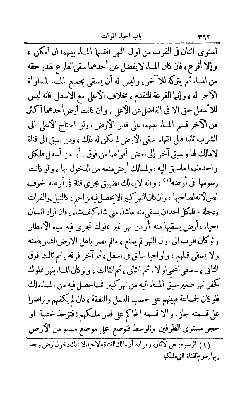 1 الرسوم: هي الآثار، ومراده أن مالك القناة بالإحياء لا يملك دخول أرض وجد ربها رسوم القناة التي ملكها.
