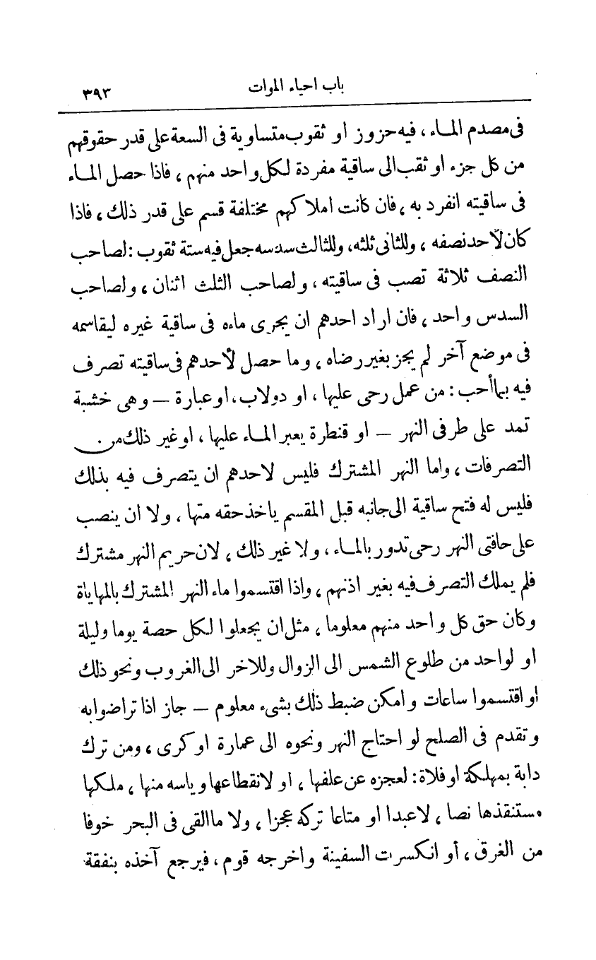 في مصدم الماء فيه حزوز أو ثقوب متساوية في السعة على قدر حقوقهم من كل جزء أو ثقب إلى ساقيه لكل واحد منهم فإذا حصل الماء في ساقيته انفرد به فإن كانت أملاكهم مختلفة قسم على قدر ذلك فإذا كان لأحد نصفه وللثاني وللثالث سدسه جعل فيه ثقوب: لصاحب النصف ثلاثة تصب في ساقيته ولصاحب الثلث اثنان ولصاحب السدس واحد فإن أراد أحدهم أن يجري ماءه في ساقية غيره ليقاسمه في موضع آخر لم يجز بغير رضاه وما حصل لأحدهم في ساقيته تصرف فيه بما أحب: من عمل رحى عليها أو دولاب أو عبارة - وهي خشبة تمد على طرفي النهر - أو قنطرة يعبر الماء عليها أو غير ذلك من التصرفات وأما النهر المشترك فليس لأحدهم أن يتصرف فيه بذلك فليس له فتح ساقية إلى جانبه قبل المقسم يأخذ حقه منها ولا أن ينصب على حافتي النهر رحى تدور بالماء ولا غير ذلك لأن حريم النهر مشترك فلم يملك التصرف فيه بغير أذنهم وإذا اقتسموا ماء النهر المشترك بالمهايأة وكان حق كل واحد منهم معلوما مثل أن يجعلوا لكل حصة يوما وليلة أو لواحد من طلوع الشمس إلى الزوال وللآخر إلى الغروب ونحو ذلك أو اقتسموا ساعات وأمكن ضبط ذلك بشيء معلوم - جاز إذا تراضوا به وتقدم في الصلح لو أحتاج النهر ونحوه إلى عمارة أو كرى ومن ترك دابة بمهلكة أو فلاة: لعجزه عن علفها أو لانقطاعها ويأسه منها ملكها مستنقذها نصا لا عبدا أو متاعا تركه عجزا ولا ما ألقى في البحر خوفا من الغرق أو انكسرت السفينة وأخرجه قوم فيرجع آخذه بنفقة