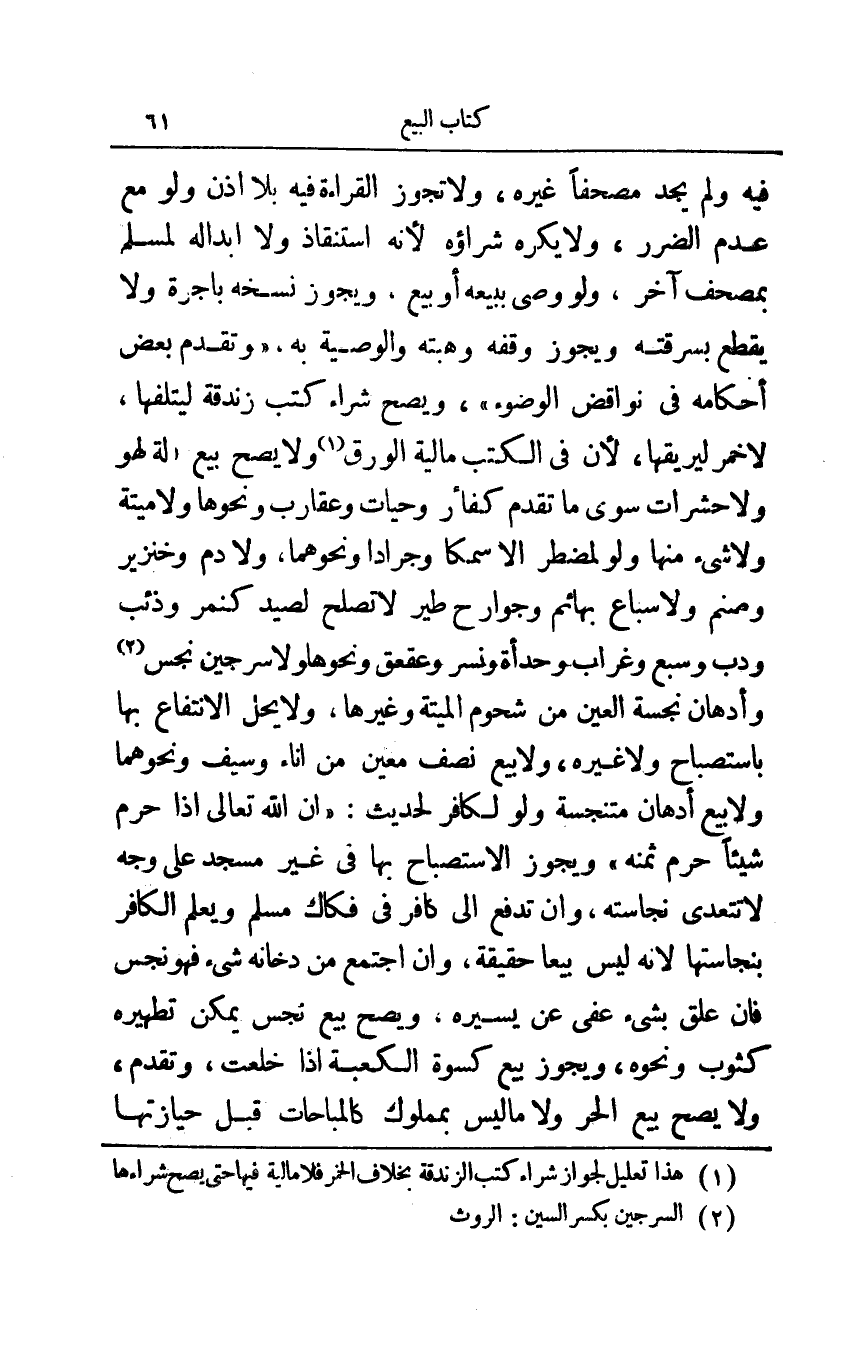 فيه ولم يجد مصحفا غيره ولا تجوز القراءة فيه لا إذن ولو مع عدم الضرر ولا يكره شراؤه لأنه استنقاذ ولا إبداله لمسلم بمصحف آخر ولو وصى ببيعه أو بيع ويجوز نسخه باجرة ولا يقطع بسرقته ويجوز وقفه وهبته والوصية به وتقدم بعض أحكامه في نواقض الوضوء ويصح شراء كتب زندقة ليتلفها لا خمر ليريقها ولأن في الكتب مالية الورق1 ولا يصح بيع آلة لهو ولا حشرات سوى ما تقدم كفأر وحيات وعقارب ونحوها ولا ميتة ولا شيء منها ولو لمضطر إلا سمكا وجرادا ونحوهما ولا دم خنزير وصنم ولا سباع بهائم وجوارح طير لا تصلح لصيد كنمر وذئب ودب وسبع وغراب وحدأة ونسر وعقعق ونحوها ولا سرجين نجس2 وأدهان نجسة العين من شحوم الميتة وغيرها ولا يحل الانتفاع بها باستصباح ولا غيره ولا بيع نصف معين من إناء وسيف ونحوهما ولا بيع أدهان متنجسة ولو لكافر لحديث: "إن الله إذا حرم شيئا حرم ثمنه" ولا يجوز الاستصباح بها في غير مسجد على وجه لا تتعدى نجاسته وإن تدفع إلى كافر في فكاك مسلم ويعلم الكافر بنجاستها لأنه ليس بيعا حقيقة وإن اجتمع من دخانه شيء فهو نجس فإن علق بشيء عفى عن يسيره ويصح بيع نجس يمكن تطهيره كثوب ونحوه ويجوز بيع كسوة الكعبة إذا خلعت وتقدم ولا يصح بيع الحر ولا ما ليس بمملوك كالمباحات قبل حيازتها
