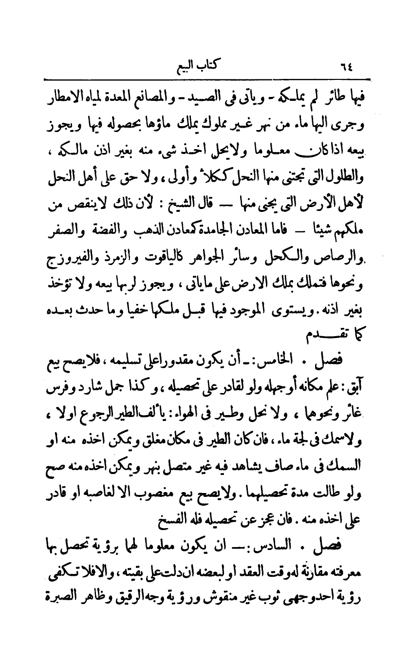 فيها طائر لم يملكه - ويأتي في الصيد - والمصانع المعدة لمياه الأمطار وجرى إليها ماء من نهر غير مملوك يملك ماؤها بحصوله فيها ويجوز بيعه إذا كان معلوما ولا يحل أخذ شيء منه بغير إذن مالكه والطلول التي تجتنى منها النحل ككلأ وأولى ولا حق على أهل النحل لأهل الأرض التي يجني منها - قال الشيخ: لأن ذلك لا ينقص من ملكهم شيئا - فأما المعادن كمعادن الذهب والفضة والصفر والرصاص والكحل وسائر الجواهر كالياقوت والزمرد والفيروزج ونحوها فتملك بملك الأرض على ما يأتي ويجوز لربها بيعه ولا تؤخذ بغير إذنه ويستوي الموجود فيها قبل ملكها خفيا وما حدث بعده كما تقدم.