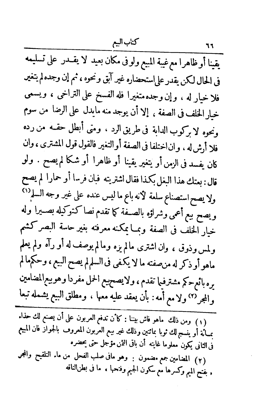 يقينا أو ظاهرا مع غيبة المبيع ولو في مكان بعيد لا يقدر على تسليمه في الحال لكن يقدر على استحضاره غير آبق ونحوه ثم إن وجده لم يتغير فلا خيار له وإن وجده متغيرا فله الفسخ على التراخي ويسمى خيار الخلف في الصفة إلا أن يوجد منه ما يدل على الرضا من سوم ونحوه لا بركوب الدابة في طريق الرد ومتى أبطل حقه من رده فلا أرش له وإن اختلفا في الصفة أو التغير فالقول قول المشتري وإن كان يفسد في الزمن أو يتغير يقينا أو ظاهرا أو شكا لم يصح ولو قال: بعتك هذا البغل بكذا فقال اشتريته فبان فرسا أو حمارا لم يصح ولا يصح استصناع سلعة لأن باع ما ليس عنده على غير وجه السلم1 ويصح بيع أعمى وشراؤه بالصفة كما تقدم نصا كتوكيله بصيرا وله خيار الخلف في الصفة وبما يمكنه معرفته بغير حدسة البصر كشم ولمس وذوق وإن اشترى ما لم يره وما لم يوصف له أو رآه ولم يعلم ما هو أو ذكره له م صفته ما لا يكفي في السلم لم يصح البيع وحكم ما لم يره بائع حكم مشتر فيما تقدم ولا يصح بيع الحمل مفردا وهو بيع المضامين والمجر2 ولا مع أمة: بأن يعقد عليه معها ومطلق البيع يشمله تبعا