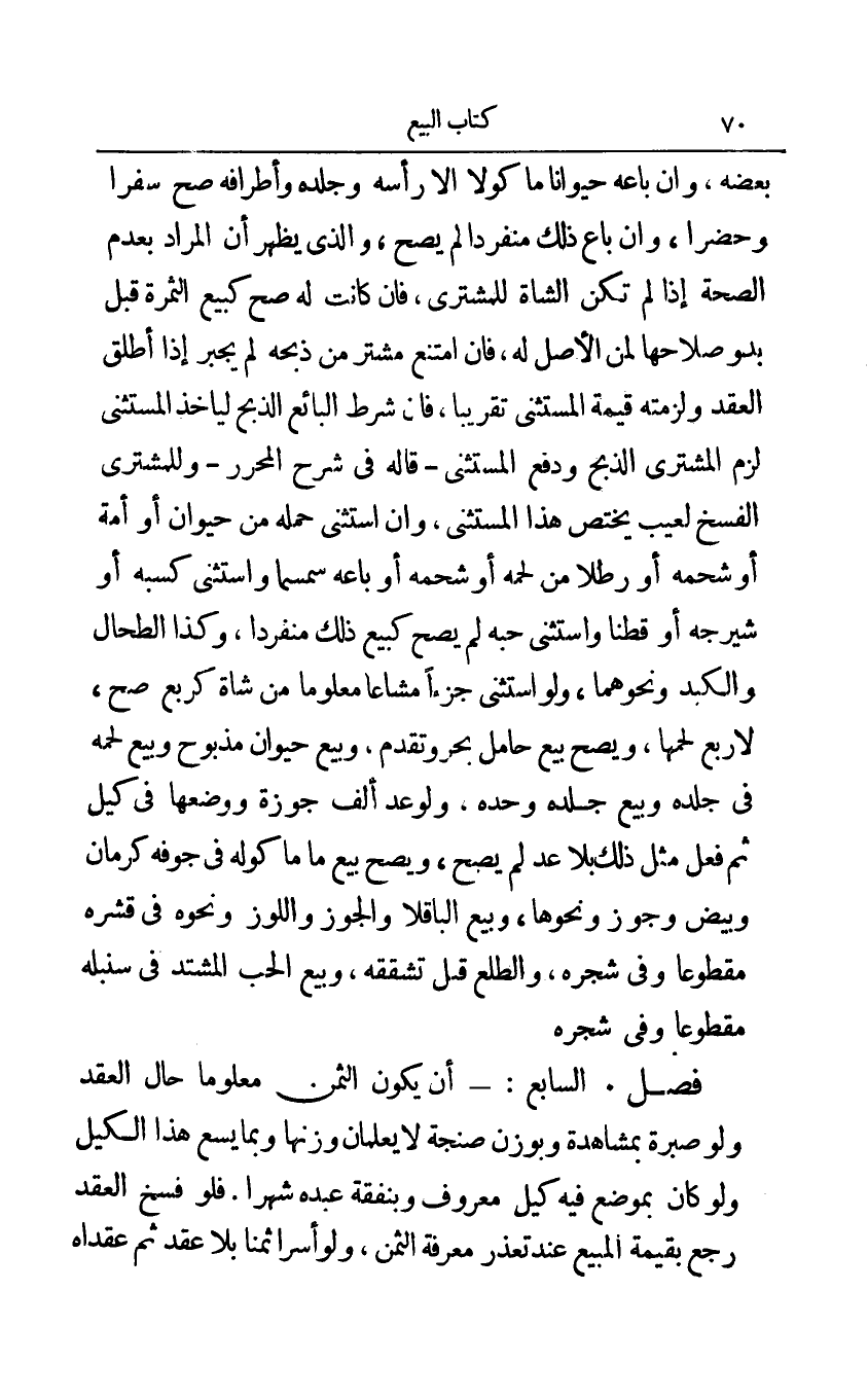 بعضه وإن باعه حيوانا مأكولا إلا رأسه وجلده وأطرافه صح سفرا وحضرا وإن باع ذلك منفردا لم يصح والذي يظهر أن المراد بعدم الصحة إذا لم تكن الشاة للمشتري فإن كانت له صح كبيع الثمرة قبل بدو صلاحها لمن الأصل له فإن امتنع مشتر من ذبحه لم يجبر إذا أطلق العقد ولزمته قيمة المستثنى تقريبا فإن اشترط البائع الذبح ليأخذ المستثنى لزم المشتري الذبح ودفع المستثنى - قاله في شرح المحرر - وللمشتري الفسخ لعيب يختص هذه المستثنى وإن استثنى حمله من حيوان أو أمة أو شحمه أو رطلا من لحمه أو شحمه أو باعه سمسما واستثنى كسبه أو شيرجه أو قطنا واستثنى حبه لم يصح كبيع ذلك منفردا وكذا الطحال والكبد ونحوهما ولو استثنى مشاعا معلوما من شاة كربع صح لا ربع لحمها ويصح بيع حامل بحر وتقدم وبيع حيوان مذبوح وبيع لحمه في جلده وبيع جلده وحده ولو عد ألف جوزة ووضعها في كيل ثم فعل مثل ذلك بلا عد لم يصح ويصح بيع ما مأكوله في جوفه كرمان وبيض وجوز ونحوها وبيع الباقلا والجوز واللوز ونحوه في قشره مقطوعا وفي شجره والطلع قبل تشققه وبيع الحب المشتد في سنبله مقطوعا وفي شجره.
