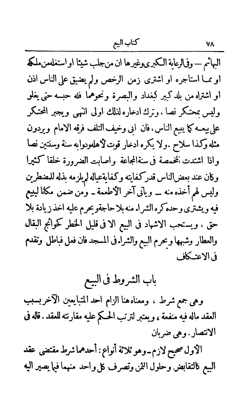 البهائم - وفي الرعاية الكبرى وغيرها أن من جلب شيئا أو استغله من ملكه أو مما استأجره أو اشترى زمن الرخص ولم يضيق على الناس إذن أو اشتراه نم بلد كبير كبغداد والبصرة ونحوهما فله حبسه حتى يغلو وليس بمحتكر نصا وترك ادخاره لذلك أولى انتهى ويجبر المحتكر على بيعه كما يبيع الناس فإن أبى وخيف التلف فرقه الإمام ويردون مثله وكذا سلاح ولا يكره ادخاره قوت لأهله ودوابه سنة وسنتين نصا وإذا اشتدت المخمصة في سنة المجاعة وأصابت الضرورة خلقا كثيرا وكان عند بعض الناس قدر كفايته وكفاية عياله لم يلزمه بذله للمضطرين وليس لهم أخذه منه - ويأتي آخر الأطعمة - ومن ضمن مكانا ليبيع فيه ويشتري وحده كره الشراء منه بلا حاجة ويحرم عليه أخذ زيادة بلا حق ويستحب الإشهاد في البيع إلا في قليل الخطر كحوائج البقال والعطار وشبهها ويحرم البيع والشراء في المسجد فإن فعل فباطل وتقدم في الاعتكاف.