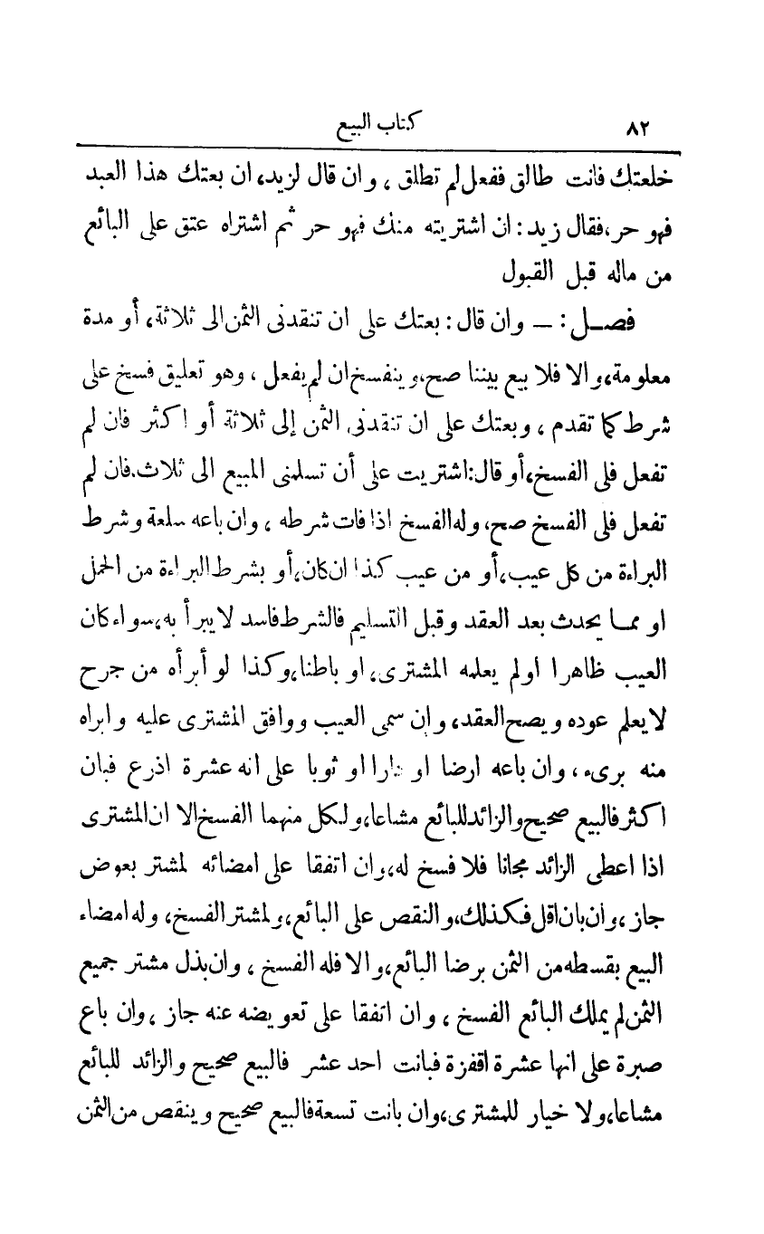 أو مدة معلومة وإلا فلا بيع بيننا صح وينفسخ إن لم يفعل وهو تعليق فسخ على شرط كما تقدم وبعتك على أن تنقدني الثمن إلى ثلاثة أو أكثر فإن لم تفعل فلي الفسخ أو قال: اشتريت على أن تسلمني المبيع إلى ثلاث فإن لم تفعل فلي الفسخ صح وله الفسخ إذا فات شرطه وإن باعه سعلة وشرط الراءة من كل عيب أو من عيب كذا إن كان أو بشرط البراءة من الحمل أو مما يحدث بعد العقد وقبل التسليم فالشرط فاسد لا يبرأ به سواء كان العيب ظاهرا أو لم يعلمه المشتري أو باطنا وكذا لو أبرأه من جرح لا يعلم عوده ويصح العقد وإن سمي العيب ووافق المشتري عليه وأبرأه بريء وإن باعه أرضا أو دارا أو ثوبا على أنه عشرة أذرع فبان أكثر فالبيع صحيح والزائد للبائع مشاعا ولكل منهما الفسخ إلا أن المشتري إذا أعطى الزائد مجانا فلا فسخ له وإن اتفقا على إمضائه لمشتر يعوض جاز وإن بان أق فكذلك والنقص على البائع ولمشتر الفسخ وله إمضاء البيع بقسطه من الثمن برضا البائع وإلا فله الفسخ وإن بذاك مشتر جميع الثمن لم يملك البائع الفسخ وإن اتفقا على تعريضه عنه جاز وإن باع صبرة على أنها عشرة أقفزة فبانت أحد عشر فالبيع صحيح والزائد للبائع مشاعا ولا خيار للمشتري وإن بانت تسعة فالبيع صحيح وينقص من الثمن