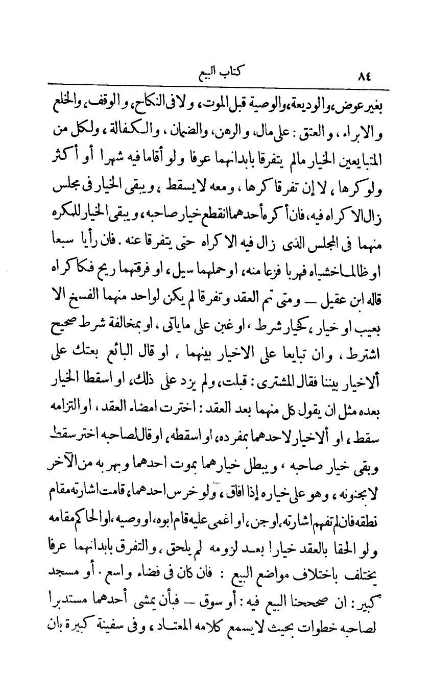 بغير عوض والوديعة والوصية قبل الموت ولا في النكاح والوقف والخلع والإبراء والعتق على مال والرهن والضمان والكفالة ولكل من المتبايعين الخيار ما لم يتفرقا بأبدانهما عرفا ولو أقاما فيه شهرا أو أكثر ولو كرها لا إن تفرقا كرها ومعه لا يسقط ويبقى الخيار في مجلس زال إلا كراه فيه فإن أكره أحدهما انقطع خيار صاحبه ويبقى الخيار للكره منهما في المجلس الذي زال فيه إلا كراه حتى يتفرقا عنه فإن رأيا سبعا أو ظالما خشياه فهربا فزعا منه أو حملهما سيل أو فرقتهما ريح فكإكراه قاله ابن عقيل - ومتى تم العقد وتفرقا لم يكن لواحد منهما الفسخ إلا بعيب أو خيار كخيار شرط أو غبن على ما يأتي أو بمخالفة شرط صحيح اشترط وإن تبايعا على الاختيار بينهما أو قال البائع بعتك على الأخيار بيننا فقال المشتري: قبلت ولم يزد على ذلك أو اسقطا الخيار بعده مثل أن يقول كل منهما بعد العقد: اخترت إمضاء العقد أو التزامه سقط أو الأخيار لأحدهما بمفرده أو أسقطه أو قاله لصاحبه أختر سقط وبقي خيار صاحبه ويبطل خيارهما بموت أحدهما وبهربه من الآخر لا بجنونه وهو على خياره إذا أفاق ولو خرس أحدهما قامت إشارته مقام نطقه فإن لم تفهم إشارته أو جن أو أغمي عليه قام أبوه أو وصيه أو الحاكم مقامه ولو الحقا بالعقد خيارا بعد لزومه لم يلحق والتفرق بأبدانهما عرفا يختلف باختلاف مواضع البيع فإن كان في فضاء واسع أو مسجد كبير إن صححنا البيع فيه أو سوق - فبأن يمشي أحدهما مستدبرا لصاحبه خطوات بحيث لا يسمع كلامه المعتاد وفي سفينة كبيرة بان