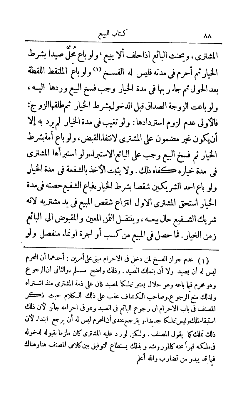 1 عدم جواز الفسخ لمن دخل في الإحرام مبني على أمرين: أحدهما أن المحرم ليس له أن يصيد ولا أن يمتلك الصيد. وذلك واضح مسلم، والثاني أن الرجوع وهو محرم فيما باعه وهو حلال يعتبر تملكا لمصيد كان على ذمة المشتري منذ اشتراه ولذلك منع الرجوع. وصاحب الكشاف عقب على ذلك الكلام حيث ذكر المصنف في باب الإحرام أن رجوع البائع في الصيد وهو في إحرامه جائز لأن ذلك استبقاء لملك وليس تملكا جديدا. ويترجح عندي أن المحرم ليس له أن يرجع ابتداء لأن ذلك تملك كما يقول المصنف ولكن لو رد عليه المشتري كان ملزما بقبوله لدخوله في ملكه قهرا عنه كالموروث، وذلك يستطاع التوفيق بين كلامي المصنف هنا وهناك فيما قد يبدو من تضارب والله أعلم.