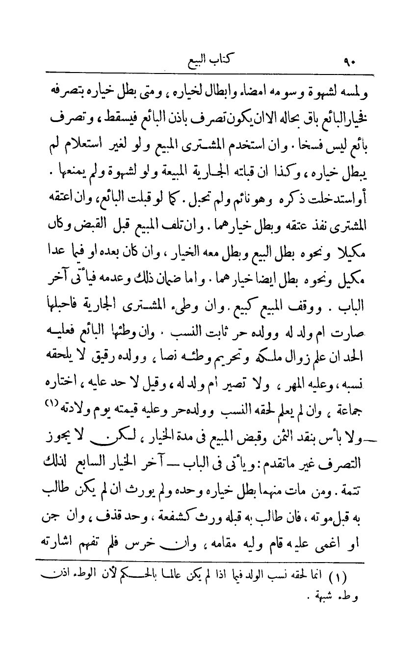 ولمسه لشهوة وسومه إمضاء وإبطال لخياره ومتى بطل خياره بتصرفه فخيار البائع باق بحاله إلا أن يكون تصرف بإذن البائع فيسقط وتصرف بائع ليس فسخا وإن استخدم المشتري المبيع ولو لغير استعلام لم يبطل خياره وكذا إن قبلته الجارية المبيعة ولو لشهوة ولم يمنعها أو استدخلت ذكره وهو نائم ولم تحبل كما لو قبلت البائع وإن اعتقه المشتري نفذ عتقه وبطل خيارهما وإن تلف المبيع قبل القبض وكان مكيلا ونحوه بطل البيع وبطل معه الخيار وإن كان بعده أو فيما عدا مكيل ونحوه بطل أيضا خيارهما وأما ضمان ذلك وعدمه فيأتي آخر الباب ووقف المبيع كبيع وإن وطىء المشتري الجارية فأحبلها صارت أم ولد له وولده حر ثابت النسب وإن وطئها البائع فعليه الحد إن علم زوال ملكه وتحريم وطئه نصا وولده رقيق لا يلحقه نسبه وعليه المهر ولا تصير أم ولد له وقيل لا حد عليه اختاره جماعة وإن لم يعلم لحقه النسب وولده حر وعليه قيمته يوم ولادته1 ولا بأس بنقد الثمن وقبض المبيع في مدة الخيار لكن لا يجوز التصرف غير ما تقدم ويأتي في الباب - آخر الخيار السابع لذلك تتمة ومن مات منهما بطل خياره وحده ولم يورث إن لم يكن طالب به قبل موته فإن طالب به قبله ورث كشفعة وحد قذف وإن جن أو أغمي عليه قام وليه مقامه وإن خرس فلم تفهم إشارته