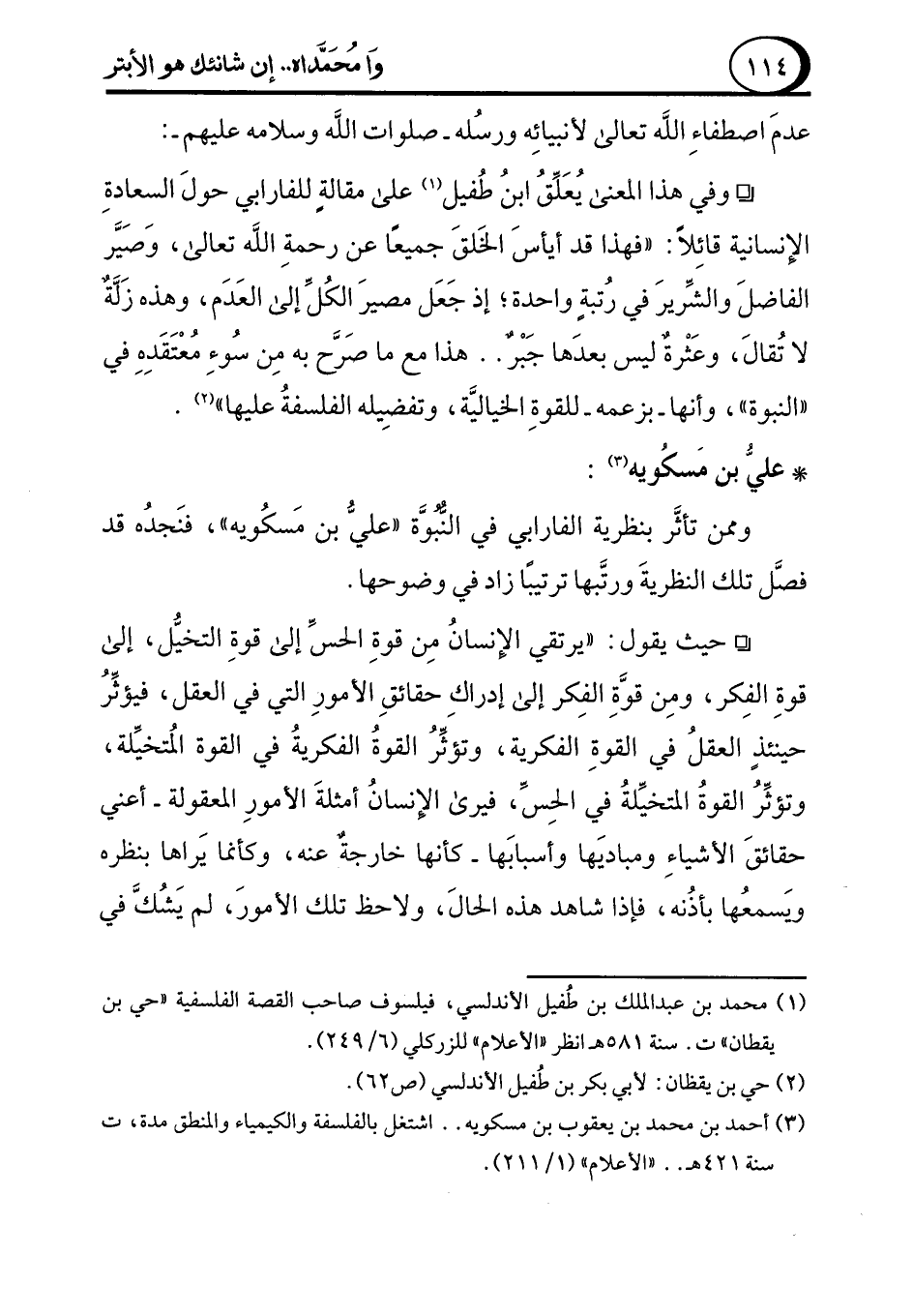 ° وفي هذا المعنى يُعَلِّقُ ابنُ طُفيل (¬1) على مقالةٍ للفارابي حول السعادةِ الإنسانية قائِلاً: "فهذا قد أيأسَ الخَلقَ جميعًا عن رحمةِ الله تعالى، وَصَيَّر الفاضلَ والشِّريرَ في رُتبةٍ واحدة؛ إذ جَعَل مصيرَ الكُلِّ إلى العَدَم، وهذه زَلَّة لا تُقالَ، وعَثْرةٌ ليس بعدَها جَبْرٌ .. هذا مع ما صَرَّح به مِن سُوءِ مُعْتَقَدِهِ في "النبوة"، وأنها -بزعمه- للقوةِ الخياليَّة، وتفضِيله الفلسفةُ عليها" (¬2).
