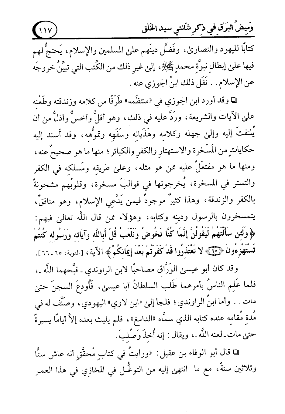 ° وقد أورد ابن الجوزي في "منتظَمه" طَرَفًا من كلامه وزندقته وطَعْنِه على الآيات والشريعة، ورَدَّ عليه في ذلك، وهو أقل وأخسُّ وأذلُّ من أن يُلتفتَ إليه وإلى جهله وكلامِه وهَذَيانِه وسَفَهِه وتموُّهِه، وقد أَسند إليه حكاياتٍ من المَسْخرة والاستهتارِ والكفرِ والكبائر؛ منها ما هو صحيحٌ عنه، ومنها ما هو مفتعَل عليه ممن هو مثله، وعلى طريقِه ومَسلكِه في الكفر والتستر في المسخرة، يُخرجونها في قوالبَ مسخرة، وقلوبهم مشحونة بالكفر والزندقة، وهذا كثيرٌ موجود فيمن يَدَّعي الإسلام، وهو منافقٌ، يتمسخرون بالرسول ودينِه وكتابه، وهؤلاء ممن قال الله تعالى فيهم: {وَلَئِنْ سَأَلْتَهُمْ لَيَقُولُنَّ إِنَّمَا كُنَّا نَخُوضُ وَنَلْعَبُ قُلْ أَبِاللَّهِ وَآيَاتِهِ وَرَسُولِهِ كُنْتُمْ تَسْتَهْزِئُونَ (65) لَا تَعْتَذِرُوا قَدْ كَفَرْتُمْ بَعْدَ إِيمَانِكُمْ} [التوبة: 65 - 66].