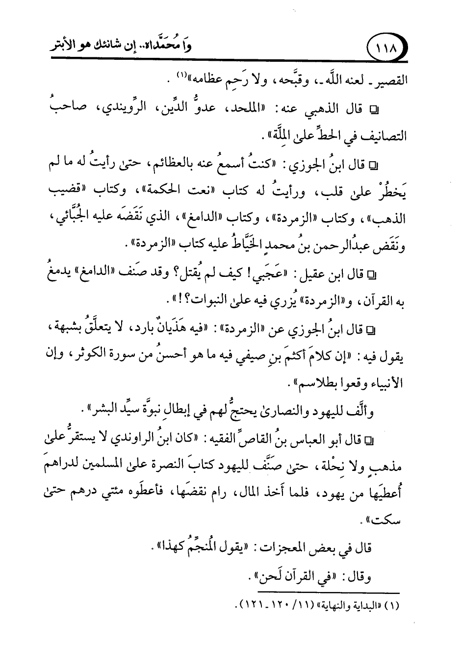 ° قال الذهبي عنه: "الملحد، عدوُّ الدين، الرِّويندي، صاحبُ التصانيف في الحط على المِلة".