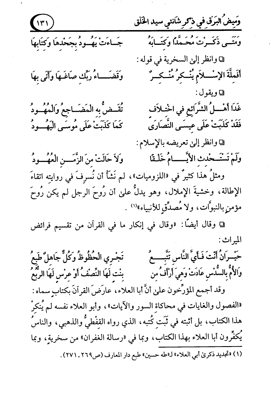 (¬1) "تجديد ذكرى أبي العلاء" لـ "طه حسين" طبع دار المعارف (ص 269 - 271).