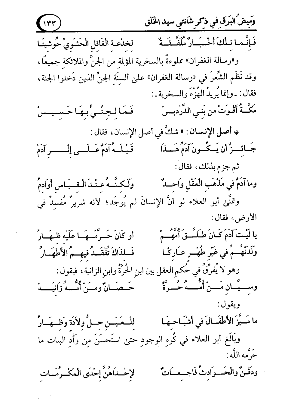 و"رسالة الغفران" مملوءةٌ بالسخرية المؤلمةِ من الجنِّ والملائكةِ جميعًا، وقد نَظَم الشِّعرَ في "رسالة الغفران" على ألسِنَةِ الجنِّ الذين دَخلوا الجنة، فقال: -وإنما يُريدُ الهُزْءَ والسخرية-: