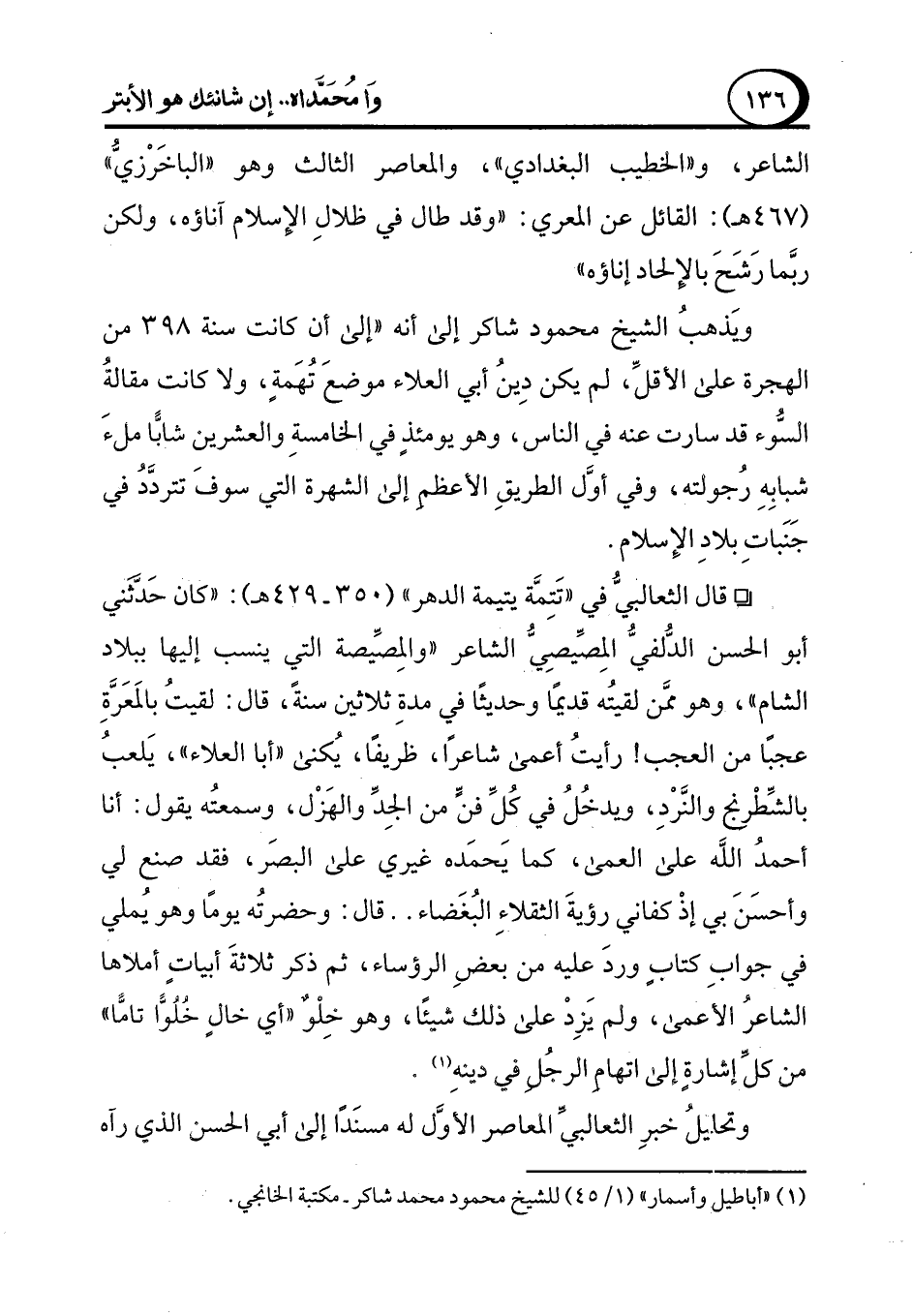 (¬1) "أباطيل وأسمار" (1/ 45) للشيخ محمود محمد شاكر - مكتبة الخانجي.