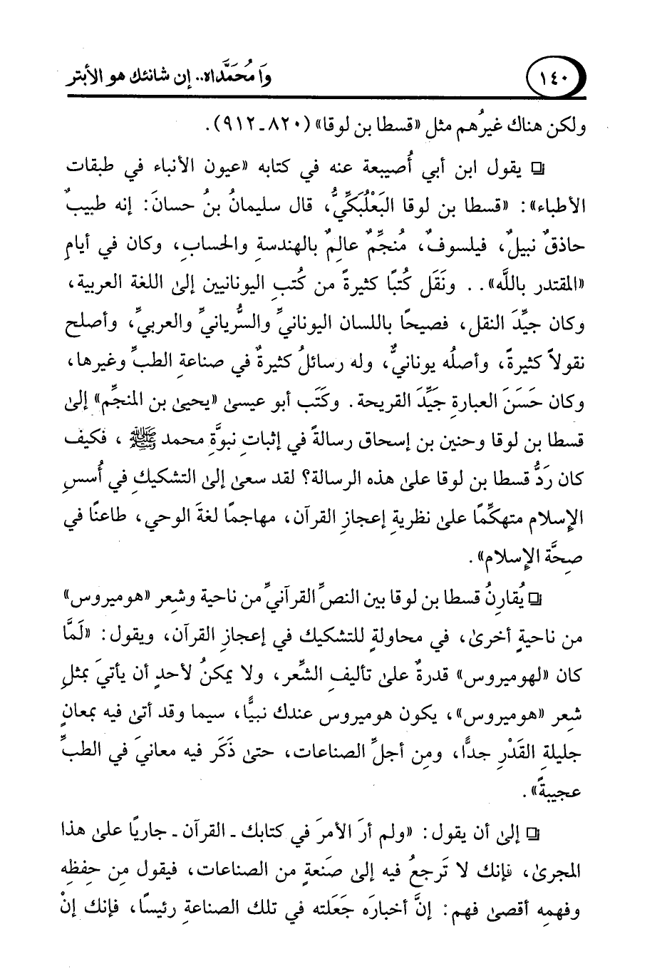 ° يقول ابن أبي أُصيبعة عنه في كتابه "عيون الأنباء في طبقات الأطباء": "قسطا بن لوقا البَعْلُبَكِّيُّ، قال سليمانُ بنُ حسانَ: إنه طبيبٌ حاذقٌ نبيلٌ، فيلسوفٌ، مُنجِّمٌ عالِمٌ بالهندسةِ والحسابِ، وكان في أيام "المقتدر بالله" .. ونَقَل كُتبًا كثيرةً من كُتبِ اليونانيين إلى اللغة العربية، وكان جيِّدَ النقل، فصيحًا باللسان اليونانيِّ والسُّريانيِّ والعربيِّ، وأصلح نقولاً كثيرةً، وأصلُه يونانيٌّ، وله رسائلُ كثيرةٌ في صناعةِ الطبِّ وغيرها، وكان حَسَنَ العبارةِ جَيِّدَ القريحة. وكَتَب أبو عيسى "يحيى بن المنجِّم" إلى قسطا بن لوقا وحنين بن إسحاق رسالةً في إثباتِ نبوَّةِ محمد - صلى الله عليه وسلم -، فكيف كان رَدُّ قسطا بن لوقا على هذه الرسالة؟ لقد سعى إلى التشكيك في أُسسِ الإسلام متهكِّمًا على نظريةِ إعجازِ القرآن، مهاجمًا لغةَ الوحي، طاعنًا في صِحَّة الإسلام".