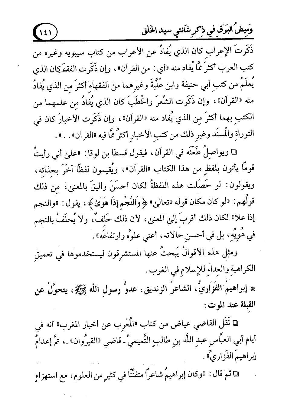 * إِبراهيمَُ الفزَاريُّ، الشاعرُ الزنديق، عدوُّ رسول الله - صلى الله عليه وسلم -، يتحوَّلُ عن القِبلة عند الموت: