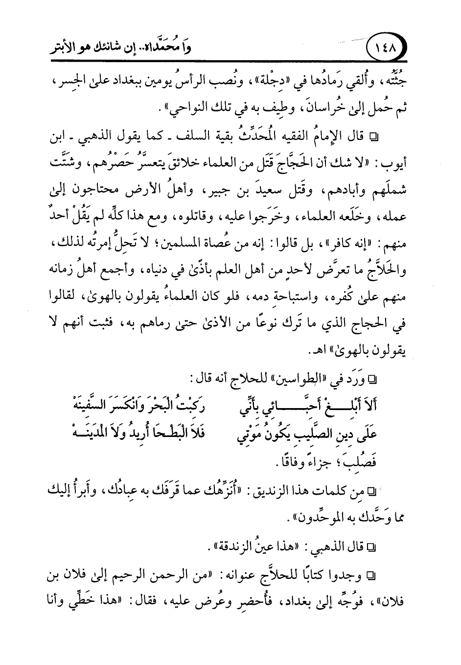 ° قال الإِمامُ الفقيه المُحَدِّثُ بقية السلف -كما يقول الذهبي- ابن أيوب: "لا شك أن الحَجَّاجَ قَتَل من العلماء خلائقَ يتعسَّرُ حَصْرُهم، وشَتَّت شملَهم وأبادهم، وقَتل سعيدَ بن جبير، وأهلُ الأرض محتاجون إلى عمله، وخَلَعه العلماء، وخَرَجوا عليه، وقاتلوه، ومع هذا كلِّه لم يَقُلْ أحدٌ منهم: "إنه كافر"، بل قالوا: إنه من عُصاة المسلمين؛ لا تَحِلُّ إمرتُه لذلك، والحَلاَّجُ ما تعرَّض لأحدٍ من أهل العلم بأذى في دنياه، وأجمع أهلُ زمانه منهم على كُفره، واستباحةِ دمه، فلو كان العلماءُ يقولون بالهوى، لقالوا في الحجاج الذي ما تَرك نوعًا من الأذى حتى رماهم به، فثبت أنهم لا يقولون بالهوى" اهـ.