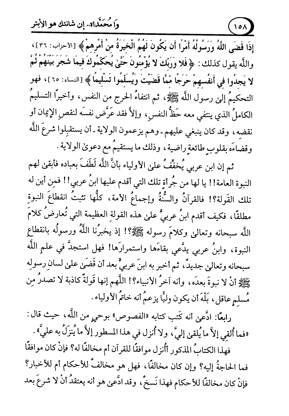فهذا الكتاب المذكور أأُنزل موافقًا للقرآن أم مخالفًا له؟ فإنْ كان موافقًا فما الحاجة إليه؟ وإن كان مخالفًا، فهل هو مخالفٌ للأحكام أم للأخبار؟ فإنْ كان مخالفًا للأحكام فهذا نَسخٌ، وقد ادَّعى هو أنه يعتقدُ أنْ لا شرعَ بعد