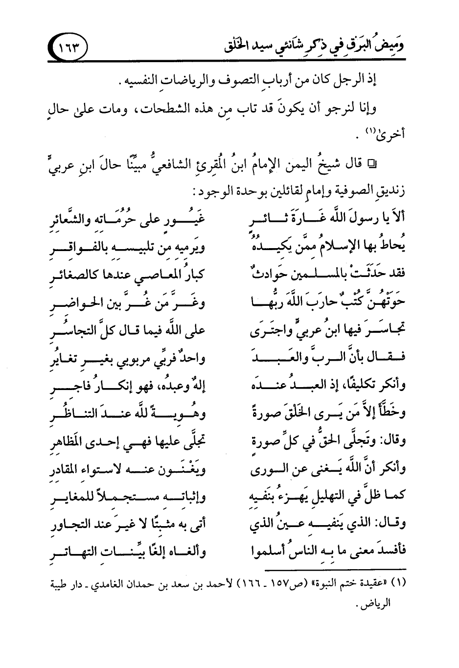 ° قال شيخُ اليمن الإمامُ ابنُ المُقِرئِ الشافعيُّ مبينًا حالَ ابنِ عربيٍّ زنديقِ الصوفية وإمامِ القائلين بوحدة الوجود: