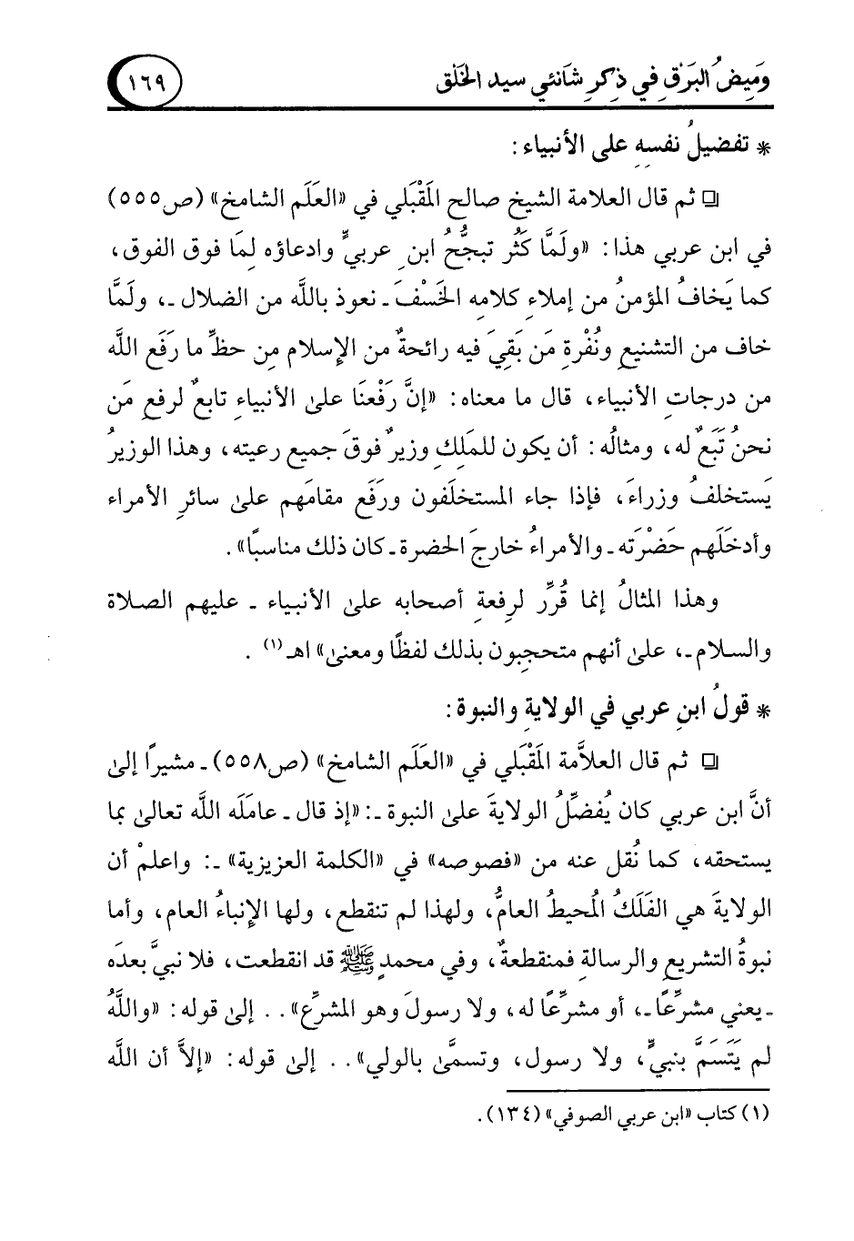 ° ثم قال العلاَّمة المَقْبَلي في "العَلَم الشامخ" (ص 558) -مشيرًا إلى أنَّ ابن عربي كان يُفضِّلُ الولايةَ على النبوة-: "إذ قال -عامَلَه الله تعالى بما يستحقه، كما نُقل عنه من "فصوصه" في "الكلمة العزيزية"-: واعلمْ أن الولايةَ هي الفَلَكُ المُحيطُ العامُّ، ولهذا لم تنقطع، ولها الإنباءُ العام، وأما نبوة التشريع والرسالةِ فمنقطعةٌ، وفي محمدٍ - صلى الله عليه وسلم - قد انقطعت، فلا نبيَّ بعدَه -يعني مشرِّعًا-, أو مشرِّعًا له, ولا رسول وهو المشرِّع" .. إلى قوله: "واللهُ لم يَتَسَمَ بنبْيٍّ، ولا رسول، وتسمَّى بالولي" .. إلى قوله: "إلاَّ أن الله