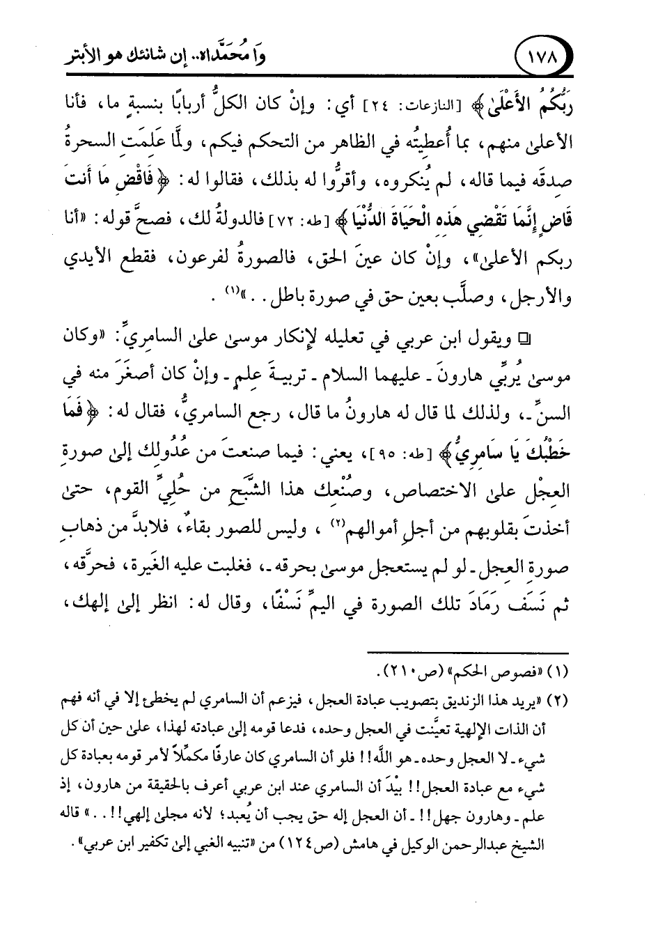 (¬2) "يريد هذا الزنديق بتصويب عبادة العجل، فيزعم أن السامري لم يخطئ إلا في أنه فهم أن الذات الإلهية تعيَّنت في العجل وحده، فدعا قومه إلى عبادته لهذا، على حين أن كل شيء -لا العجل وحده- هو الله!! فلو أن السامري كان عارفًا مكملاً لأمر قومه بعبادة كل شيء مع عبادة العجل!! بيْدَ أن السامري عند ابن عربي أعرف بالحقيقة من هارون، إذ علم -وهارون جهل!! - أن العجل إله حق يجب أن يُعبد؛ لأنه مجلى إلهي!! .. " قاله الشيخ عبد الرحمن الوكيل في هامش (ص 124) من "تنبيه الغبي إلى تكفير ابن عربي".