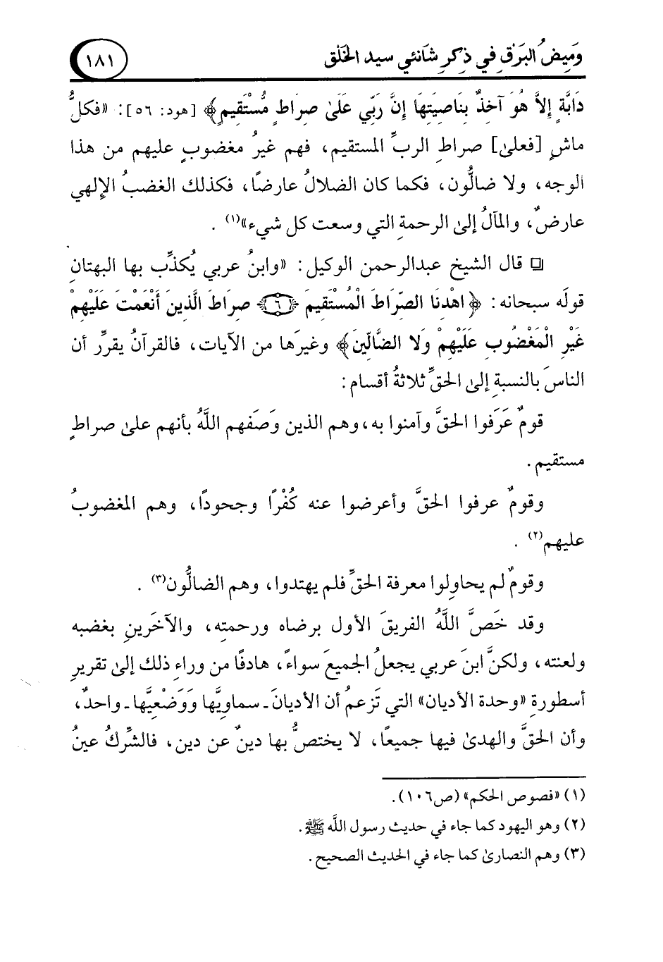 ° قال الشيخ عبد الرحمن الوكيل: "وابن عربي يُكذِّب بهذا البهتانِ قولَه سبحانه: {اهْدِنَا الصِّرَاطَ الْمُسْتَقِيمَ (6) صِرَاطَ الَّذِينَ أَنْعَمْتَ عَلَيْهِمْ غَيْرِ الْمَغْضُوبِ عَلَيْهِمْ وَلَا الضَّالِّينَ} وغيرَها من الآيات، فالقرآن يقرِّر أن الناسَ بالنسبةِ إلى الحقِّ ثلاثة أقسام:
