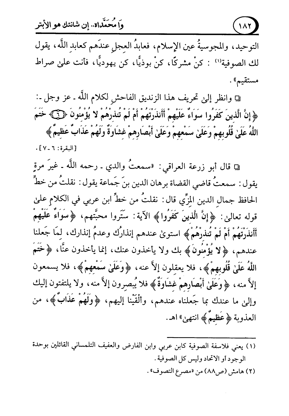 ° قال أبو زرعة العراقي: "سمعتُ والدي - رحمه الله - غيرَ مرةٍ يقول: سمعتُ قاضي القضاة برهان الدين بنَ جَماعة يقول: نقلتُ من خطِّ الحافظ جمالِ الدين المِزِّي قال: نقلتُ من خطِّ ابن عربي في الكلام على قوله تعالى: {إِنَّ الَّذِينَ كَفَرُوا} الآية: سَتَروا محبَّتهم، {سَوَاءٌ عَلَيْهِمْ أَأَنْذَرْتَهُمْ أَمْ لَمْ تُنْذِرْهُمْ} استوى عندهم إنذارُك وعدمُ إنذارك، لِمَا جَعلنا عندهم، {لَا يُؤْمِنُونَ} بك ولا يأخذون عنك، إنما يأخذون عنَّا، {خَتَمَ اللَّهُ عَلَى قُلُوبِهِمْ}، فلا يعقِلون إلاَّ عنه، {وَعَلَى سَمْعِهِمْ}، فلا يسمعون إلاَّ منه، {وَعَلَى أَبْصَارِهِمْ غِشَاوَةٌ} فلا يُبصِرون إلاَّ منه، ولا يلتفتون إليك وإلى ما عندك بما جَعلناه عندهم، وألْقَيْنا إليهم، {وَلَهُمْ عَذَابٌ}، من العذوبة {عَظِيمٌ} انتهى" اهـ.