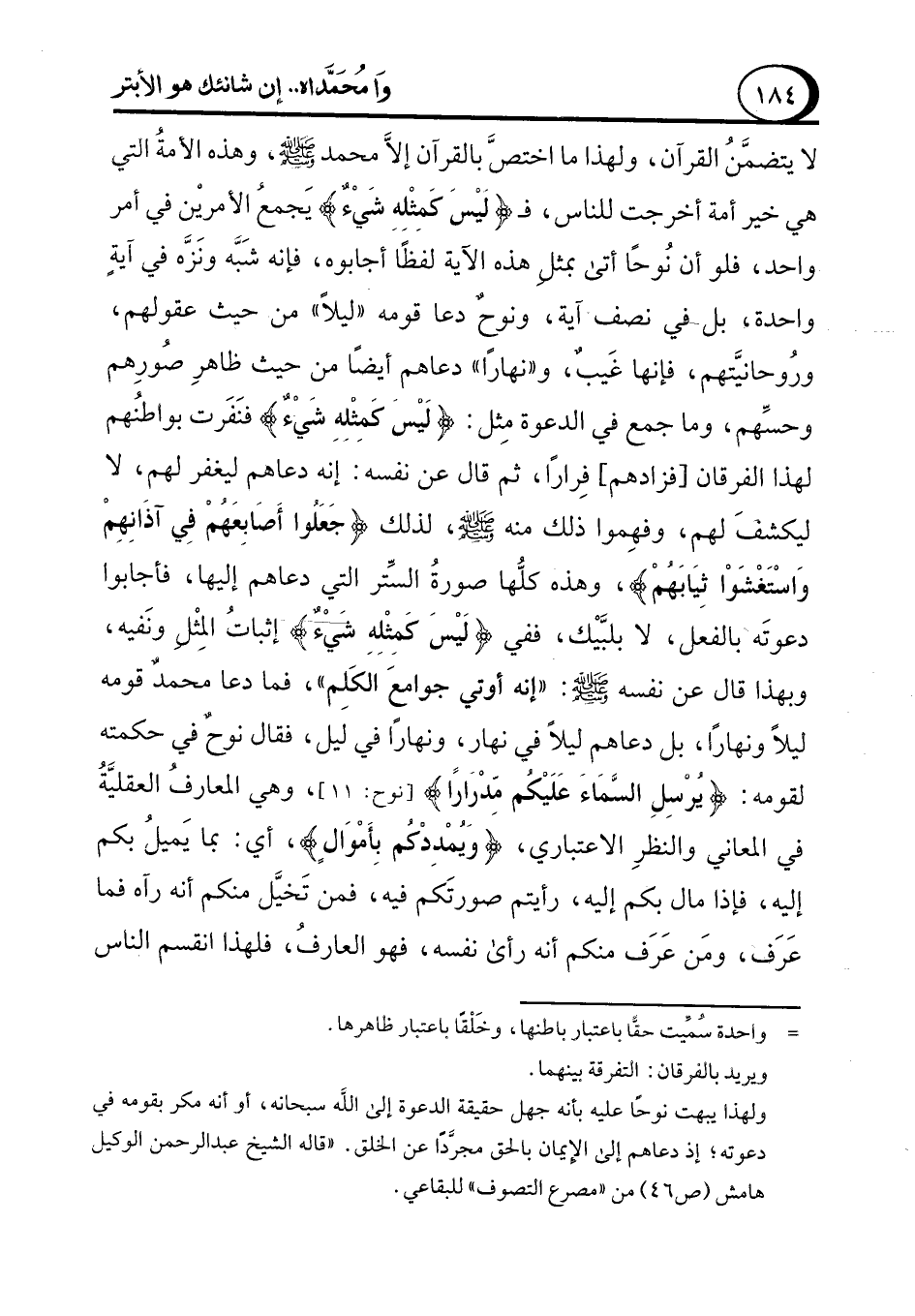لا يتضمَّن القرآن، ولهذا ما اختصَّ بالقرآن إلاَّ محمد - صلى الله عليه وسلم - وهذه الأمة التي هي خير أمة أخرجت للناس، فـ {لَيْسَ كَمِثْلِهِ شَيْءٌ} يَجمع الأمرين في أمر واحد، فلو أن نُوحًا أتى بمثل هذه الآية لفظًا أجابوه، فإنه شَبَّه ونَزَّه في آية واحدة، بل في نصف آية، ونوحٌ دعا قومه "ليلاً" من حيث عقولهم، ورُوحانيَّتهم، فإنها غَيبٌ، و"نهارًا" دعاهم أيضًا من حيث ظاهرِ صورِهم وحسِّهم، وما جمع في الدعوة مِثل: {لَيْسَ كَمِثْلِهِ شَيْءٌ} فنَفَرت بواطنهم لهذا الفرقان [فزادهم] فِرارًا، ثم قال عن نفسه: إنه دعاهم ليغفر لهم، لا ليكشفَ لهم، وفهِموا ذلك منه - صلى الله عليه وسلم -، لذلك {جَعَلُوا أَصَابِعَهُمْ فِي آذَانِهِمْ وَاسْتَغْشَوْا ثِيَابَهُمْ}، وهذه كلُّها صورةُ السِّتر التي دعاهم إليها، فأجابوا دعوتَه بالفعل، لا بلبَّيْك، ففي {لَيْسَ كَمِثْلِهِ شَيْءٌ} إثبات المِثْل ونَفيه، وبهذا قال عن نفسه - صلى الله عليه وسلم -: "إنه أوتي جوامعَ الكَلِم"، فما دعا محمدٌ قومه ليلاً ونهارًا، بل دعاهم ليلاً في نهار، ونهارًا في ليل، فقال نوحٌ في حكمته لقومه: {يُرْسِلِ السَّمَاءَ عَلَيْكُمْ مِدْرَارًا} [نوح: 11]، وهي المعارف العقليَّةُ في المعاني والنظرِ الاعتباري، {وَيُمْدِدْكُمْ بِأَمْوَالٍ}، أي: بما يَميل بكم إليه، فإذا مال بكم إليه، رأيتم صورتَكم فيه، فمن تَخيَّل منكم أنه رآه فما عَرَف، ومَن عَرَف منكم أنه رأى نفسه، فهو العارفُ، فلهذا انقسم الناس