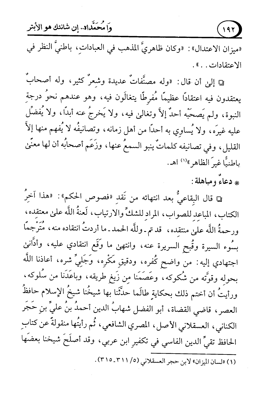 ° قال البِقاعيُّ بعد إنتهائه من نَقدِ "فصوص الحكم": "هذا آخِرُ الكتاب، المباعِدِ للصواب، الرادِ للشكِّ والارتياب، لَعنةُ الله على معتقِده، ورحمة الله على منتقِده، قد تم -ولله الحمد- ما أردتُ انتقاده منه، مُتَرْجمًا بسوء السيرة وقُبحِ السريرة عنه، وانتهى ما وَقَع انتقادي عليه، وأدَّانى اجتهادي إليه: من واضح كفره، ودقيقِ مَكْرِه، وَجَلِيِّ شره، أعاذنا الله بحوله وقوَّته من شكوكه، وعَصَمَنا مِن زَيغِ طريقه، وباعَدَنا من سلوكه، ورأيت أن أختم ذلك بحكايةٍ طالَما حدَّثنَا بها شيخنا شيخ الإِسلام حافظ العصر، قاضي القضاة، أبو الفضل شهاب الدين أحمدُ بنُ علي بن حَجَر الكناني، العسقلاني الأصل، المصري الشافعي، ثُم رأيتها منقولةً عن كتاب الحافظ تقي الدين الفاسي في تكفيرِ ابن عربي، وقد أصلحَ شيخنا بعضَها