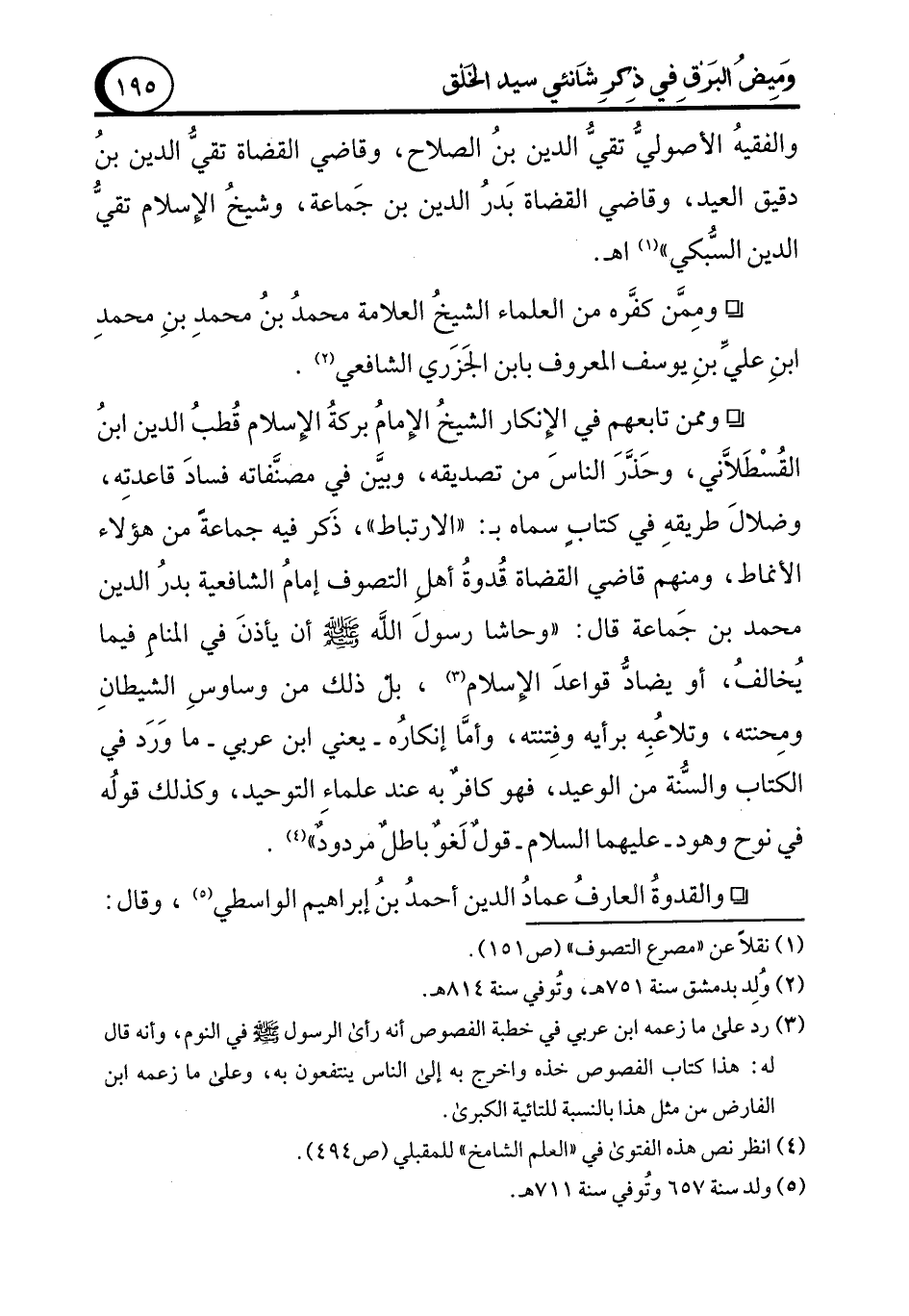 ° وممن تابعهم في الإنكار الشيخ الإمام بركةُ الإسلام قطب الدين ابنُ القسْطَلاَّني، وحَذَّرَ الناسَ من تصديقه، وبيَّن في مصنَّفاته فسادَ قاعدتِه، وضلالَ طريقهِ في كتابٍ سماه بـ: "الارتباط"، ذَكر فيه جماعةً من هؤلاء الأنماط، ومنهم قاضي القضاة قدوةُ أهل التصوف إمامُ الشافعية بدرُ الدين محمد بن جَماعة قال: "وحاشا رسولَ الله - صلى الله عليه وسلم - أن يأذنَ في المنام فيما يُخالف، أو يضادُّ قواعدَ الإسلام (¬3)، بل ذلك من وساوسِ الشيطانِ ومِحنته، وتلاعبِه برأيه وفِتنته، وأمَّا إنكارُه -يعني ابن عربي- ما وَرَد في الكتاب والسُّنة من الوعيد، فهو كافرٌ به عند علماءِ التوحيد، وكذلك قولُه في نوح وهود - عليهما السلام - قولٌ لَغوٌ باطل مردودٌ" (¬4).