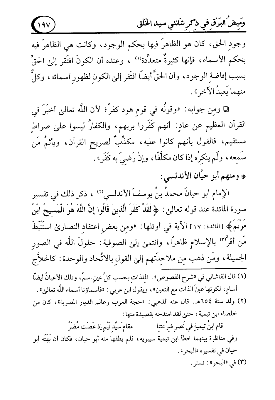 الإِمام أبو حيانَ محمدُ بنُ يوسفَ الأندلسي (¬2)، ذكر ذلك في تفسير سورة المائدة عند قوله تعالى: {لَقَدْ كَفَرَ الَّذِينَ قَالُوا إِنَّ اللَّهَ هُوَ الْمَسِيحُ ابْنُ مَرْيَمَ [المائدة: 17] الآية في أوئلها: "ومِن بعضِ اعتقادِ النصارى استَنْبَطَ مَن أقرَّ (¬3) بالإِسلام ظاهرًا، وانتمى إلى الصوفية: حلولَ الله في الصورِ الجميلة، ومَن ذهب مِن ملاحِدَتهم إلى القولِ بالاتِّحاد والوحدة: كالحلاَّج