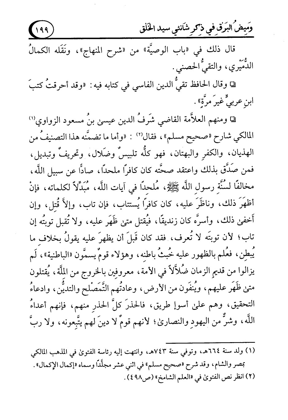 ° ومنهم العلاَّمة القاضي شَرف الدين عيسى بنُ مسعود الزواوي (¬1) المالكي شارح "صحيح مسلم"، فقال (¬2): "وأما ما تضمَّنه هذا التصنيفُ من الهذيان، والكفرِ والبهتان، فهو كلُّه تلبيسٌ وضَلال، وتحريفٌ وتبديل، فمن صَدَّق بذلك واعتقد صحَّته كان كافرًا ملحدًا، صادًّا عن سبيل الله، مخالفًا لسُنَّةِ رسولِ الله - صلى الله عليه وسلم -، مُلحدًا في آيات الله، مُبَدِّلا لكلماته، فإنْ أظهَرَ ذلك، وناظَرَ عليه، كان كافرًا يستتاب، فإن تاب، وإلاَّ قتِل، وإن أَخفى ذلك، وأسرَّه كان زنديقًا، فيُقتل متى ظَهَر عليه، ولا تُقبل توبته إن تاب؛ لأن توبتَه لا تُعرف، فقد كان قَبلَ أن يظهرَ عليه يقولُ بخلافِ ما يُبطِن، فعلم بالظهور عليه خُبثُ باطنِه، وهؤلاء قومٌ يسمَّون "الباطنية"، لَم يزالوا من قديم الزمان ضُلاَّلاً في الأمة، معروفِين بالخروج من الملَّة، يُقتلون متى ظَهَر عليهم، ويُنفَون من الأرض، وعادتُهم التَّمَصْلح والتديُّن، وادعاءُ التحقيق، وهم على أسوإ طريق، فالحذر كلَّ الحذرِ منهم، فإنهم أعداءُ الله , وشرٌّ من اليهود والنصارى؛ لأنهم قومٌ لا دينَ لهم يتَّبِعونه، ولا ربَّ