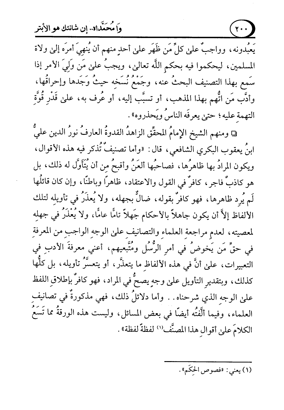° ومنهم الشيخ الإمامُ المحقِّق الزاهدُ القدوةُ العارفُ نور الدين عليُّ ابنُ يعقوب البكري الشافعي، قال: "وأما تصنيفٌ تُذكر فيه هذه الأقوال، ويكون المراد بها ظاهرُها، فصاحبُها ألعَنُ وأقبحُ مِن أن يُتَأَوَّل له ذلك، بل هو كاذبٌ فاجر، كافرٌ في القول والاعتقاد، ظاهرًا وباطنًا، وإن كان قائلُها لَم يُرِد ظاهرها، فهو كافرٌ بقوله، ضالٌّ بجهله، ولا يُعذَرُ في تأويلِه لتلك الألفاظ إلاَّ أن يكون جاهلاً بالأحكام جَهلاً تامًّا عامًّا ولا يُعْذَرُ في جهلِه لمعصيته، لعدمِ مراجعةِ العلماءِ والتصانيفِ على الوجهِ الواجبِ من المعرفةِ في حق مَن يخوضُ في أمرِ الرُّسُل ومُتَّبعيهم، أعني معرفةَ الأدبِ في التعبيرات، على أنَّ في هذه الألفاظِ ما يتعذَّر، أو يتعسَّرُ تأويله، بل كلُّها كذلك، وبتقديرِ التأويل على وجهٍ يصحُّ في المراد، فهو كافرٌ بإطلاقِ اللفظ على الوجهِ الذي شرحناه .. وأما دلائلُ ذلك، فهي مذكورةٌ في تصانيفِ العلماء، وفيما ألَّفتُه أيضًا في بعض المسائل، وليست هذه الورقةُ مما تَسَعُ الكلام على أقوال هذا المصنَّف (¬1) لفظةً لفظة".