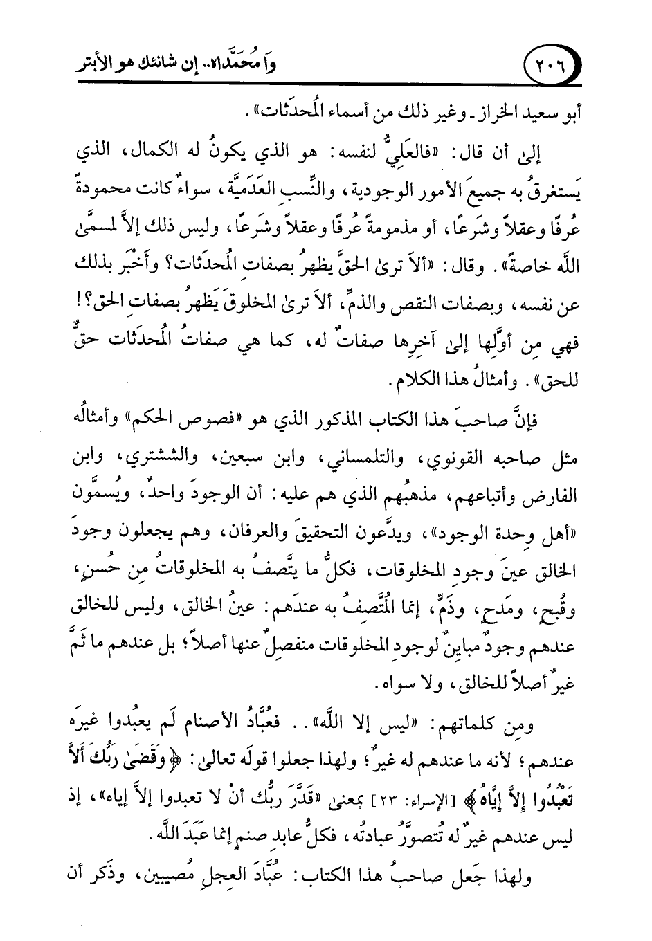 إلى أن قال: "فالعَلِيُّ لنفسه: هو الذي يكونُ له الكمال، الذي يَستغرقُ به جميِعَ الأمور الوجودية، والنِّسبِ العَدَميَّة، سواءٌ كانت محمودةً عُرفًا وعقلاً وشرعًا، أو مذمومةً عُرفًا وعقلاً وشرَعًا , وليس ذلك إلاَّ لمسمَّى الله خاصةً". وقال: "ألاَ ترى الحقَّ يظهرُ بصفاتِ المُحدَثات؟ وأَخْبَر بذلك عن نفسه، وبصفات النقص والذمِّ، ألاَ ترى المخلوقَ يَظهرُ بصفاتِ الحق؟! فهي مِن أوَّلِها إلى آخِرِها صفاتٌ له، كما هي صفات المحدَثات حقٌّ للحق". وأمثالُ هذا الكلام.