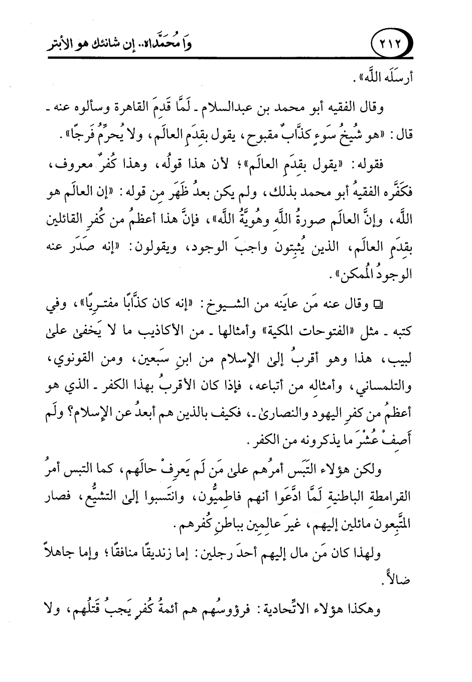 فقوله: "يقول بقِدَم العالَم"؛ لأن هذا قوله، وهذا كفرٌ معروف، فكَفَّره الفقيه أبو محمد بذلك، ولم يكن بعد ظَهَر مِن قوله: "إن العالَم هو الله، وإنَّ العالَم صورةُ اللَّهِ وهويَّة الله"، فإن هذا أعظم من كفرِ القائلين بقِدَم العالم، الذين يُثبِتون واجبَ الموجود، ويقولون: "إنه صَدَر عنه الوجود المُمكن".