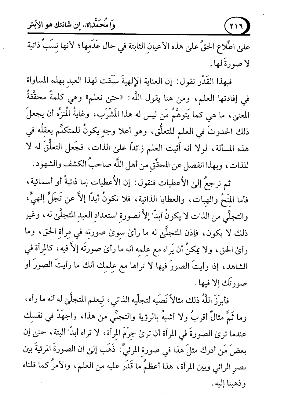 ثم نرجعُ إلى الأُعطيات فنقول: إن الأُعطيات إما ذاتية أو أسمائية، فأما المنَحُ والهِبات، والعطايا الذاتية، فلا تكونُ أبدًا إلاَّ عن تَجَلٍّ إلهيٍّ، والتجلِّي من الذات لا يكونُ أبدًا إلاَّ لصورةِ استعدادِ العبدِ المتجلَّى له، وغير ذلك لا يكون، فإذن المتجلَّى له ما رأى سِوى صورتِه في مِرآةِ الحق، وما رأى الحق، ولا يمكن أن يَراه مع عِلمِه أنه ما رأى صورتَه إلاَّ فيه، كالمِرآة في الشاهد, إذا رأيتَ الصورَ فيها لا تراها مع عِلمِك أنك ما رأيتَ الصورَ أو صورتَك إلا فيها.