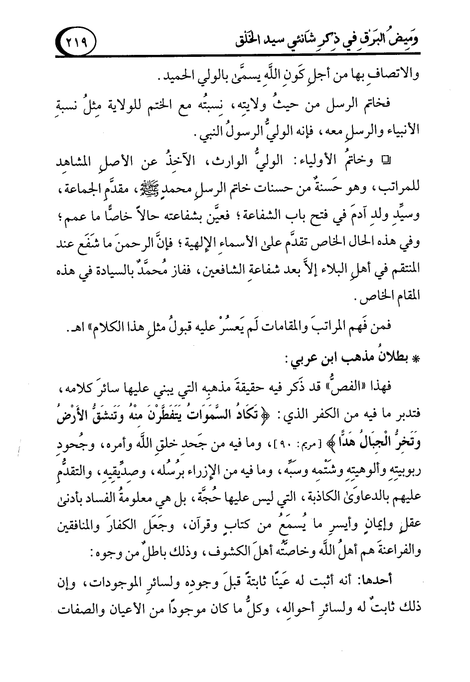 ° وخاتمُ الأولياء: الوليُّ الوارث، الآخِذُ عن الأصل المشاهِد للمراتب، وهو حَسنةٌ من حسنات خاتم الرسل محمدٍ - صلى الله عليه وسلم -، مقدَّمِ الجماعة، وسيِّدِ ولدِ آدمَ في فتح باب الشفاعة, فعيَّن بشفاعته حالاً خاصًّا ما عمم، وفي هذه الحال الخاص تقدَّم على الأسماءِ الإلهية؛ فإنَّ الرحمنَ ما شَفَع عند المنتقم في أهلِ النبلاء إلاَّ بعد شفاعةِ الشافعين، ففاز مُحمَّدٌ بالسيادة في هذه المقام الخاص.