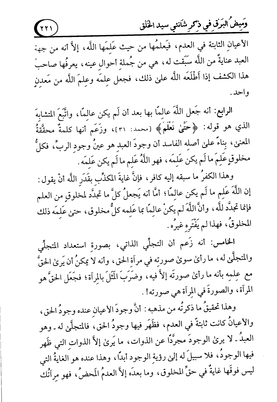 الرابع: أنه جَعل اللَّهَ عالِما بها بعد أن لَم يكن عالِمًا، واتَّبَعَ المتشابِهَ الذي هو قوله: {حَتَّى نَعْلَمَ} [محمد: 31]، وزَعَم أنها كلمةٌ محقَّقْةُ المعنى، بِناءً على أصلِه الفاسد أن وجودَ العبدِ هو عين وجودِ الربِّ، فكلُّ مخلوقٍ عَلِمَ ما لَم يكن عَلِمَه، فهو الله عَلِم ما لَم يكن عَلِمَه.