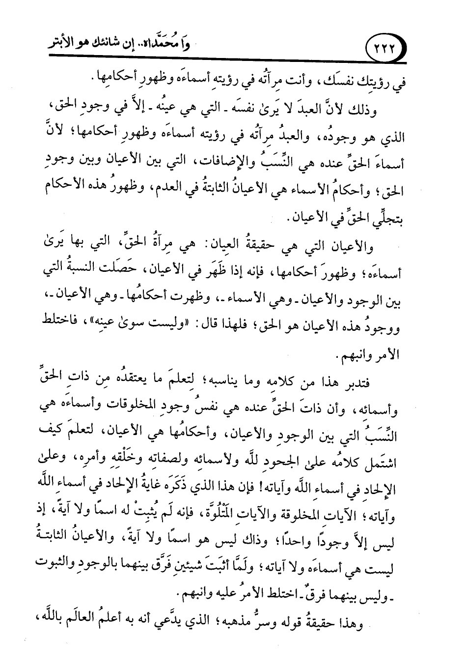 فتدبر هذا من كلامه وما يناسبه؛ لِتعلمَ ما يعتقدُه مِن ذاتِ الحقِّ وأسمائِه، وأن ذاتَ الحقِّ عنده هي نفسُ وجودِ المخلوقات وأسماءَه هي النِّسَبُ التي بين الوجودِ والأعيان، وأحكامُها هي الأعيان، لتعلمَ كيف اشتَمل كلامُه على الجحودِ لله ولأسمائِه ولصفاتِه وخَلْقِهِ وأمرِه، وعلى الإلحادِ في أسماءِ الله وآياته! فإن هذا الذي ذَكَرَه غايةُ الإلحاد في أسماءِ الله وآياته؛ الآيات المخلوقة والآياتِ المَتْلُوَّة، فإنه لَم يُثبِتْ له اسمًا ولا آيةً، إذ ليس إلاَّ وجودًا واحدًا؛ وذاك ليس هو اسمًا ولا آيةً، والأعيانُ الثابتةُ ليست هي أسماءَه ولا آياته؛ ولمَّا أثبَتَ شيئينِ فَرق بينهما بالوجودِ والثبوت -وليس بينهما فرقٌ- اختلط الأمرُ عليه وانبهم.