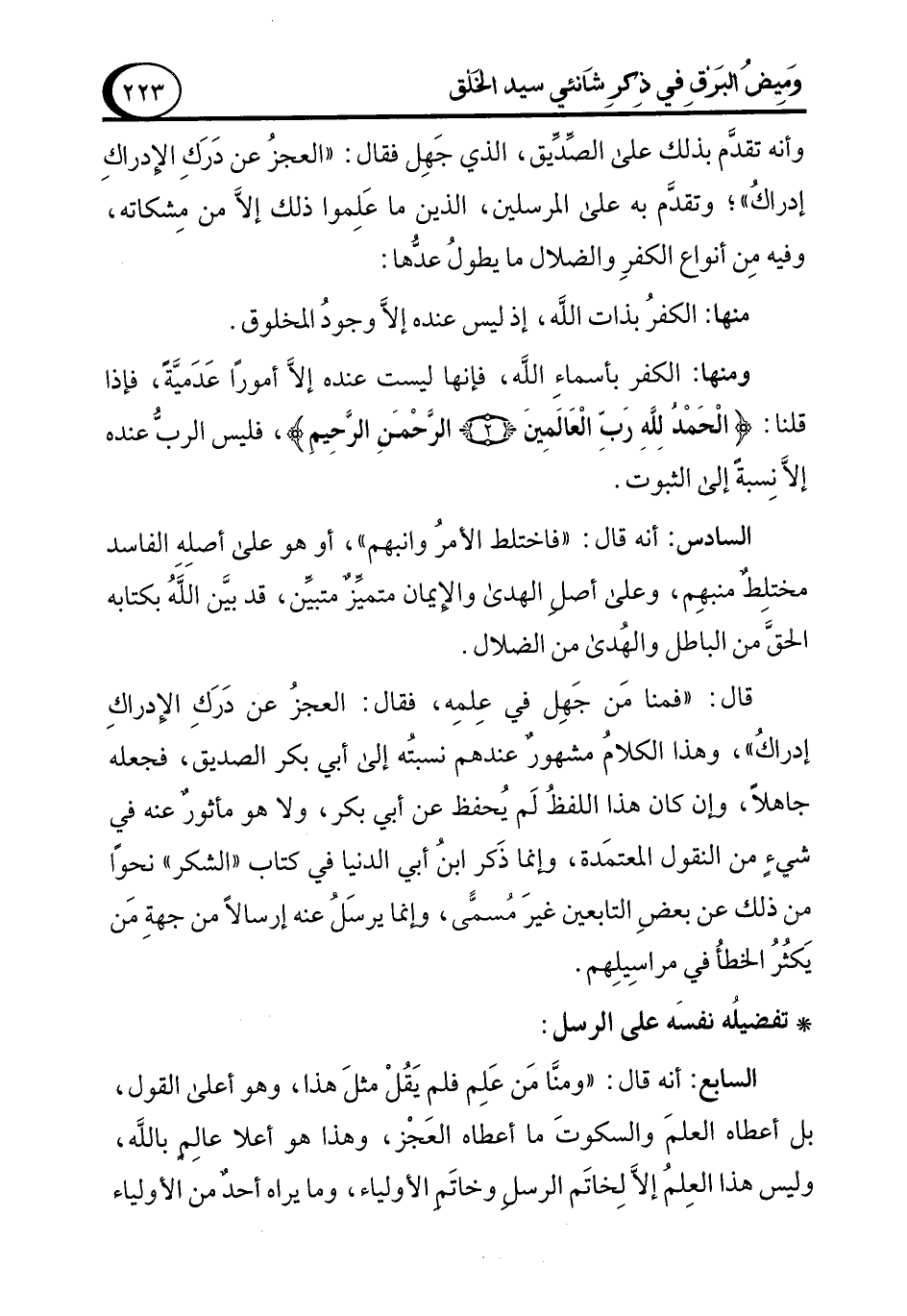 وأنه تقدَّم بذلك على الصِّدِّيق، الذي جَهِل فقال: "العجزُ عن دَرَكِ الإدراكِ إدراكُ"؛ وتقدَّم به على المرسلين، الذين ما عَلِموا ذلك إلاَّ من مِشكاته، وفيه مِن أنواع الكفرِ والضلال ما يطولُ عدُّها: